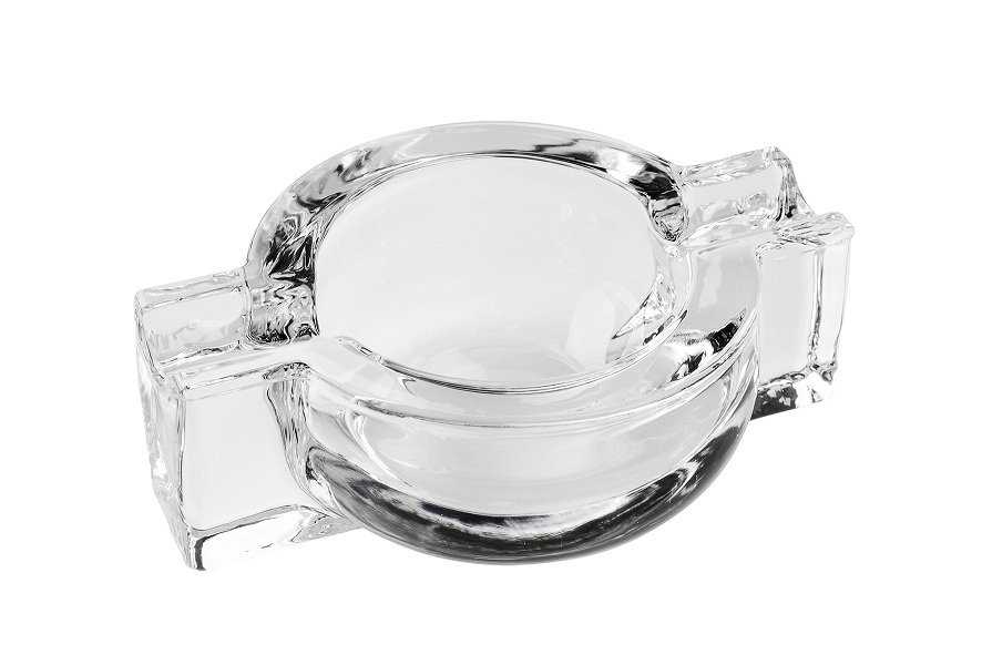 Transparent, glass ashtray for two cigars.