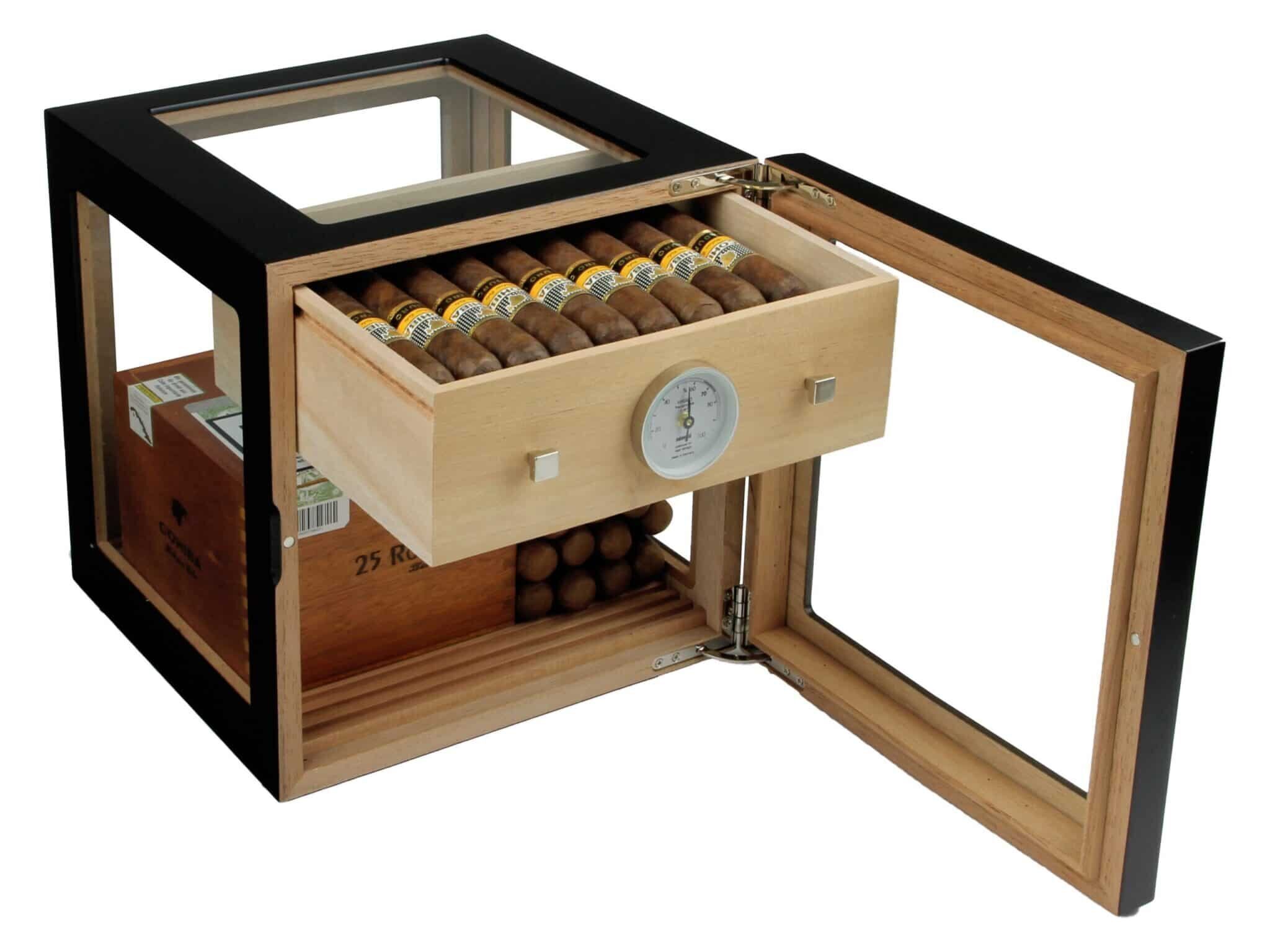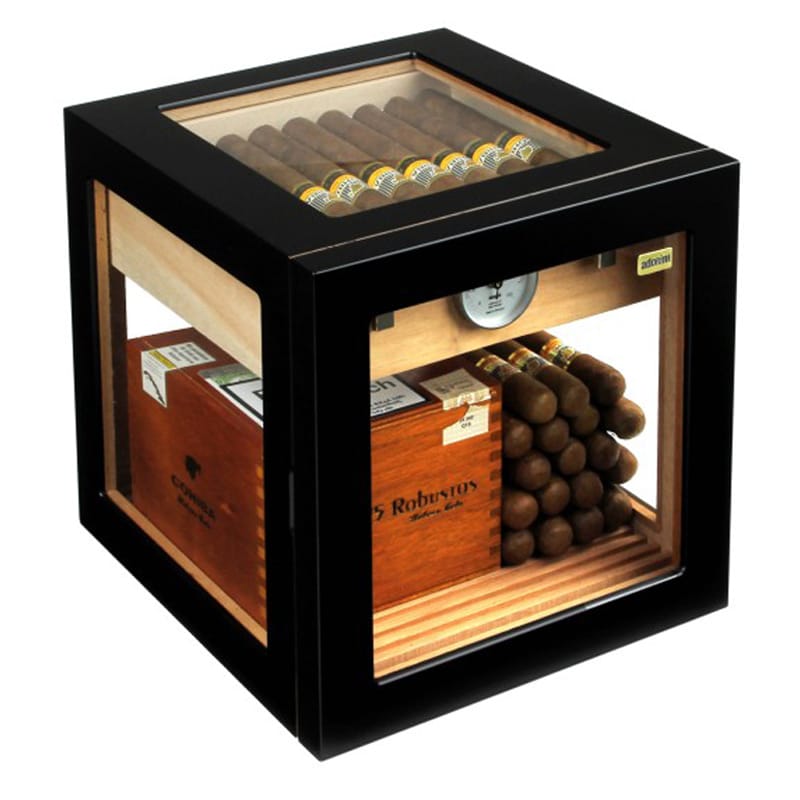 A high quality, lacquered humidor with modern, excellent design, cube-shaped and calibrated high-precision hygrometer.