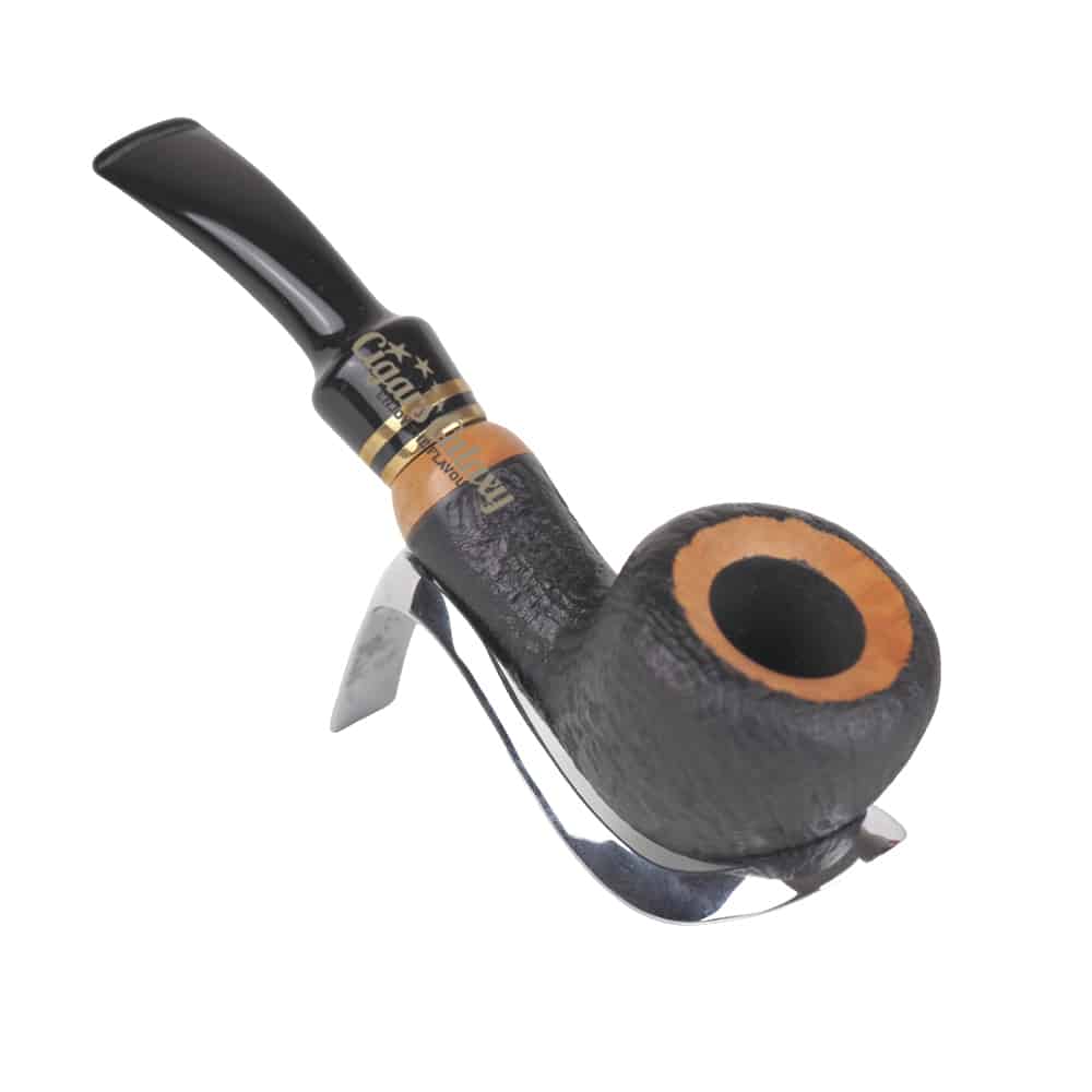 Aldo Morelli 80725 is a beautiful pipe with an apple black rustic bowl and light brown details. The 9mm acrylic stem is decorated with two gold color rings.