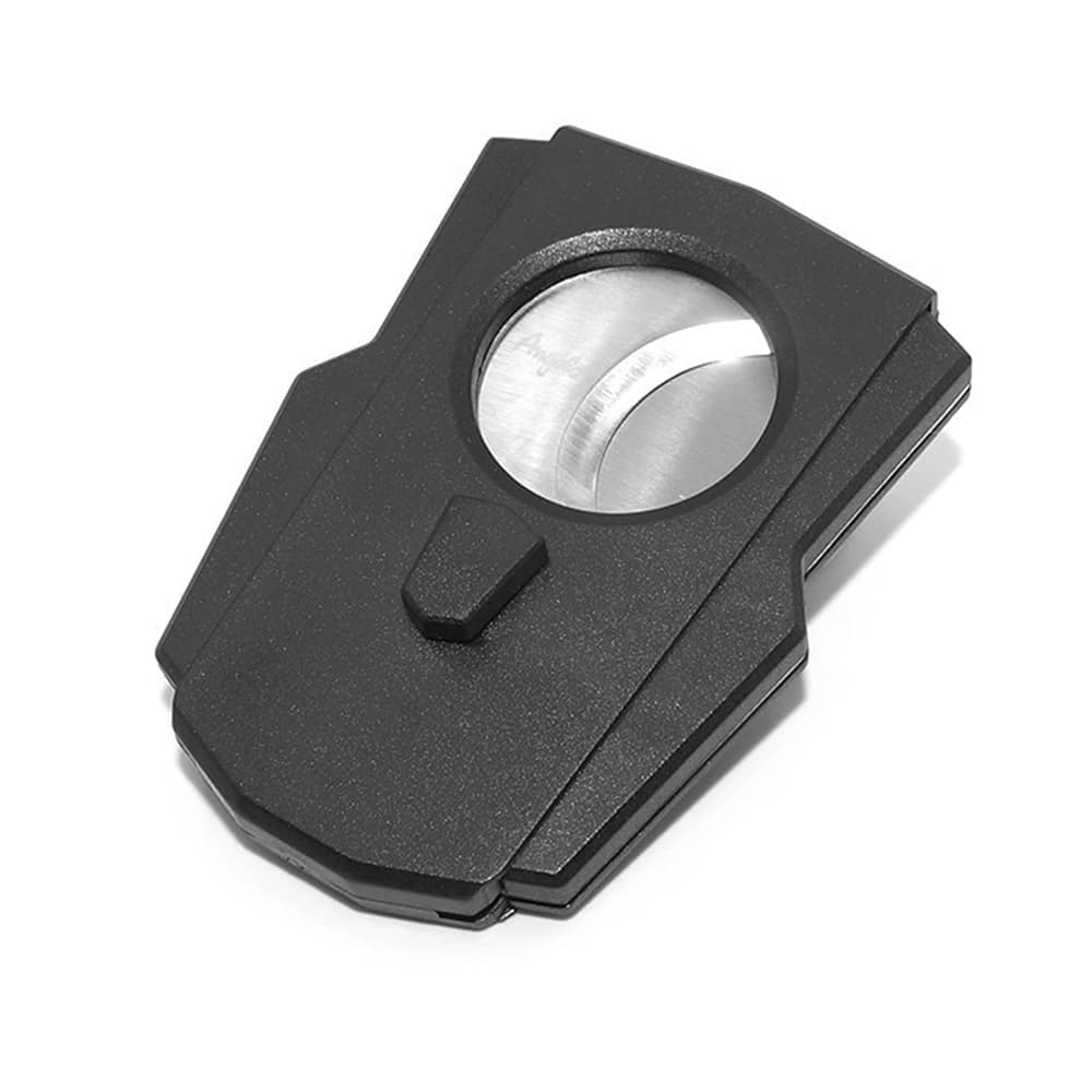 Angelo’s double guillotine cigar cutter made of stainless steel and plastic in black color. It has a button to release the blades.