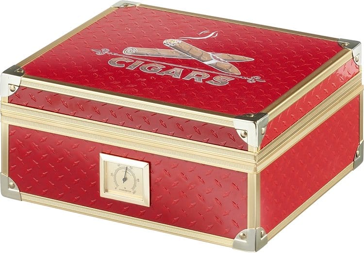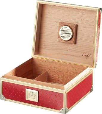 A very unique design humidor by Angelo. Made of red embossed metal with golden frame and a beautiful cigar logo.