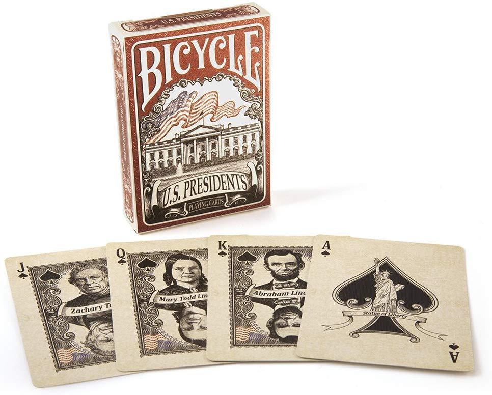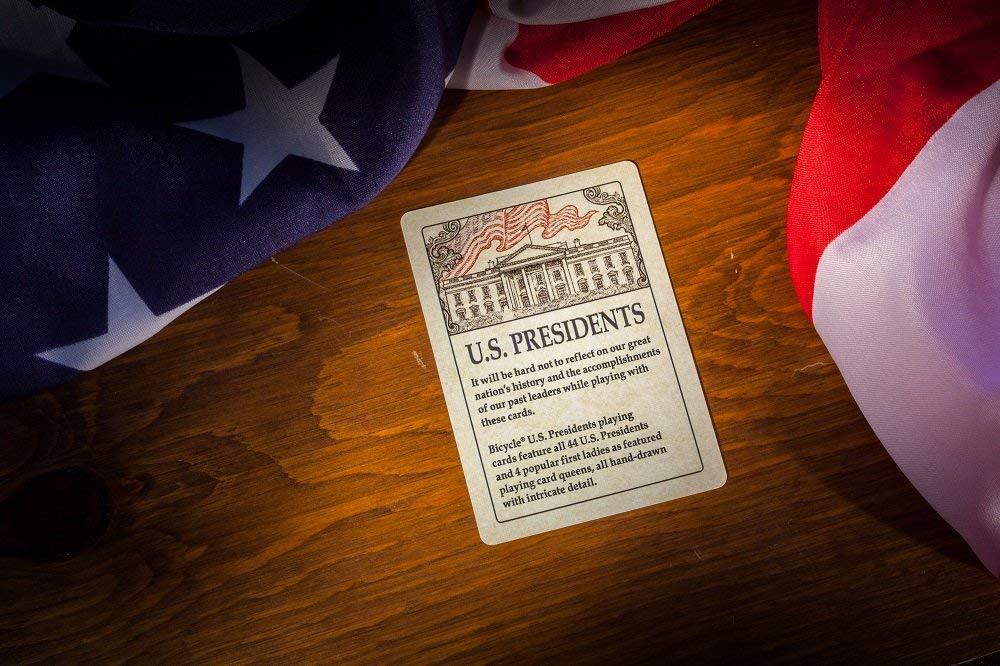The Bicycle® U.S. Presidents Playing Cards features all 44 U.S. Presidents on the card faces. The kings are the four presidents sculpted in Mount Rushmore; George Washington, Thomas Jefferson, Abraham Lincoln, and Theodore Roosevelt. Their wives, the first ladies, are featured as playing card queens. All card faces are hand-drawn with intricate detail. And, for magicians, one of the Jokers can be used to reveal a previously selected card.