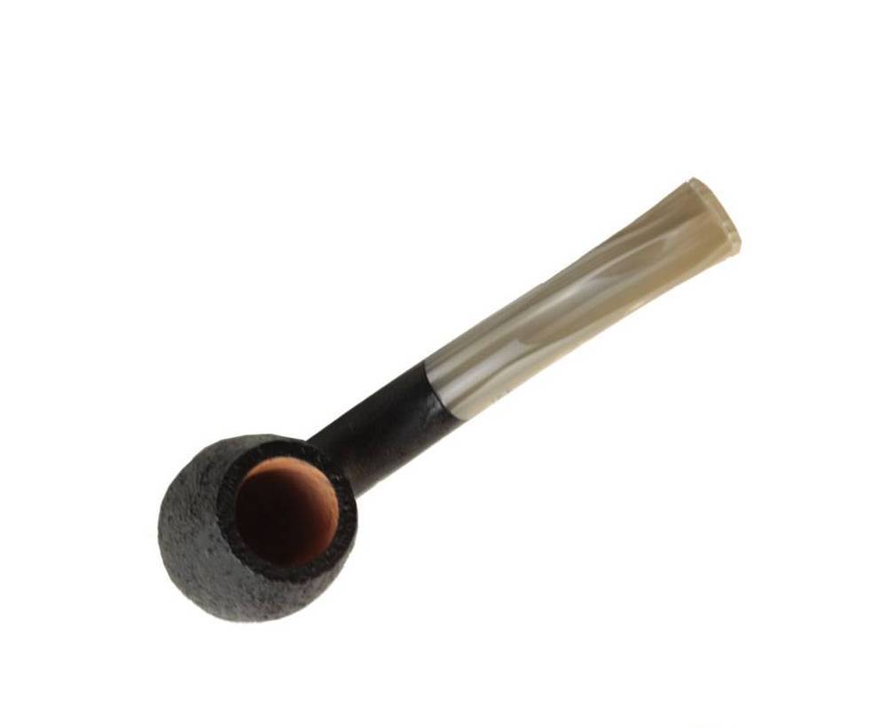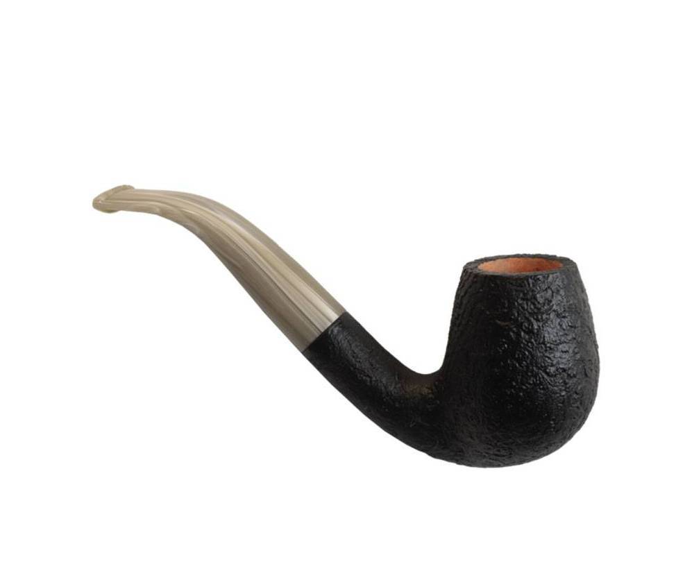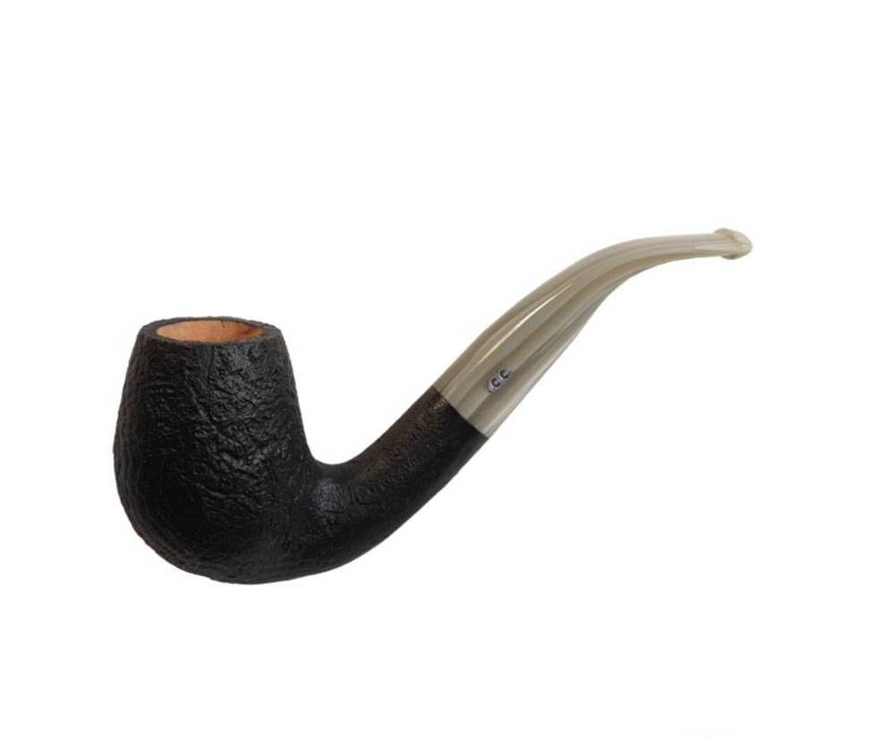The CHACOM Jurassic n°851 is a beautiful bent pipe with a black rusticated finish and a grey acrylic stem. This well-balanced pipe offers a comfortable mouth feel.