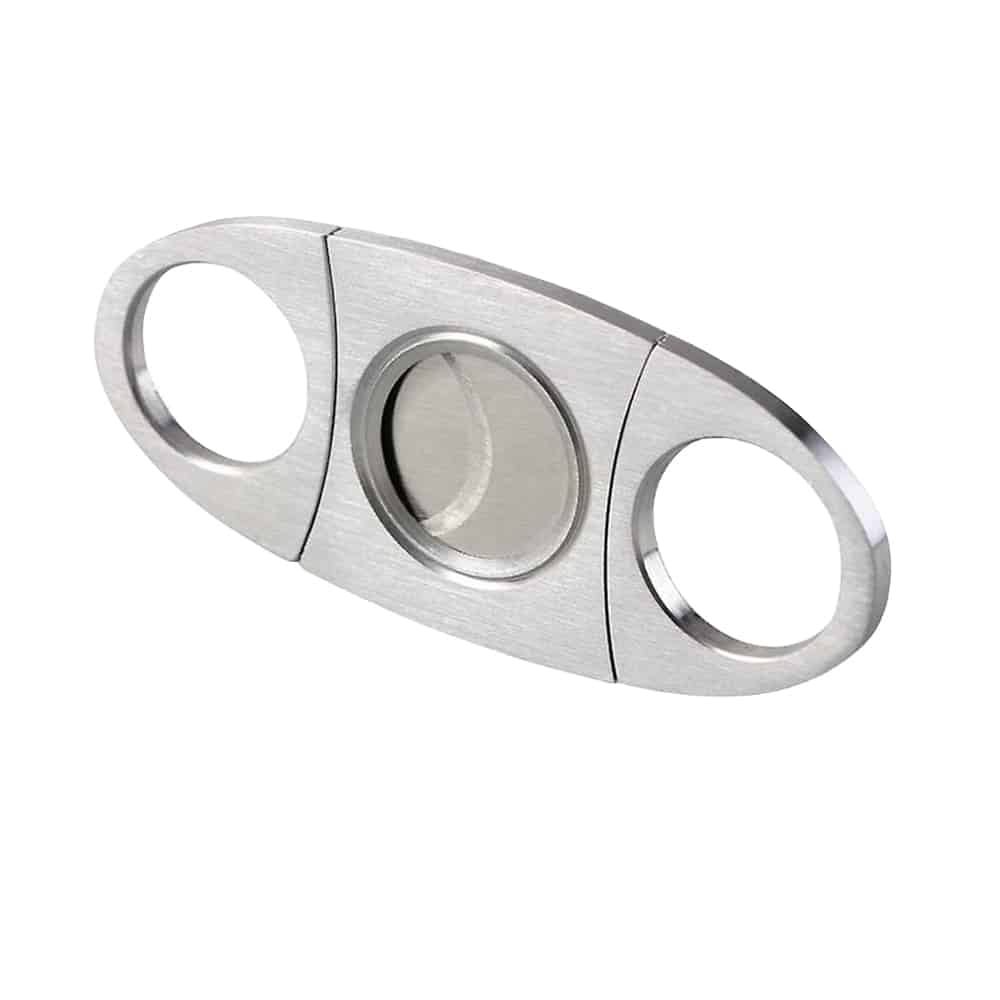 Metal guillotine cigar cutter made of stainless steel in matte silver with a large cutting diameter. Cuts up to ring 80.