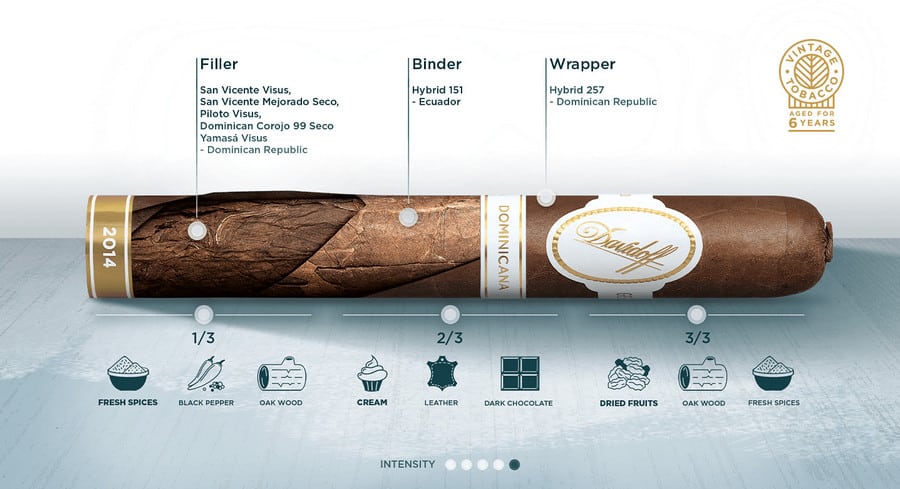 Tobacco San Vincente Mejorado Visus, San Vincente Ligero, Piloto Visus and Corojo 99 Seco star in a spectacle of flavors and offer a perfectly orchestrated taste show that bears the stamp of Davidoff Master Blender.