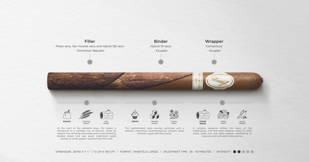 Davidoff’s brand history is rich in exceptional cigar innovations and iconic achievements. Amongst these past innovations, this Panetela Larga with a pigtail, was groundbreaking and caused quite a stir in the cigar world with its excellence in craftsmanship, and its uniqueness. To many aficionados, the cigars from that period are legendary creations they reminisce about.