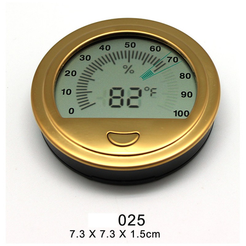 Precision electronic hygrometer/thermometer in gold color.