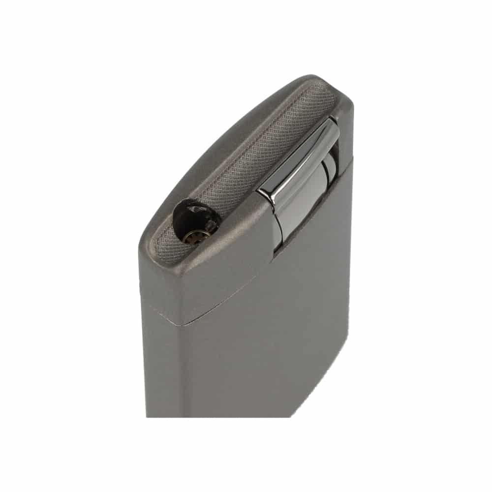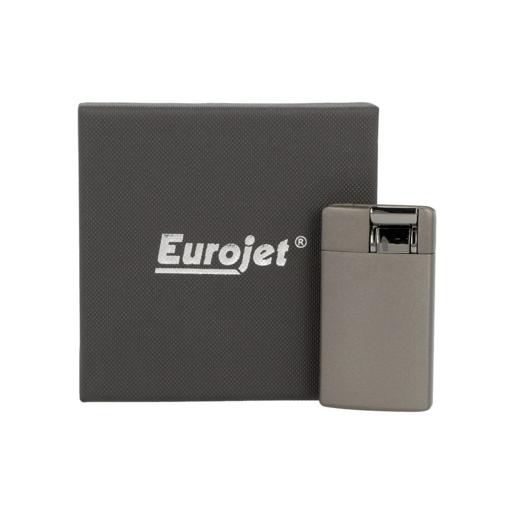 Eurojet Jet Lighter. Metallic with a matte surface in gunmetal color. Pushing the front button down ignites a strong flame to light your cigar. At the bottom of the lighter, we find the gas filling valve and the flame intensity control. In a gift box.