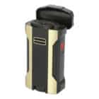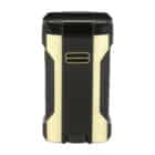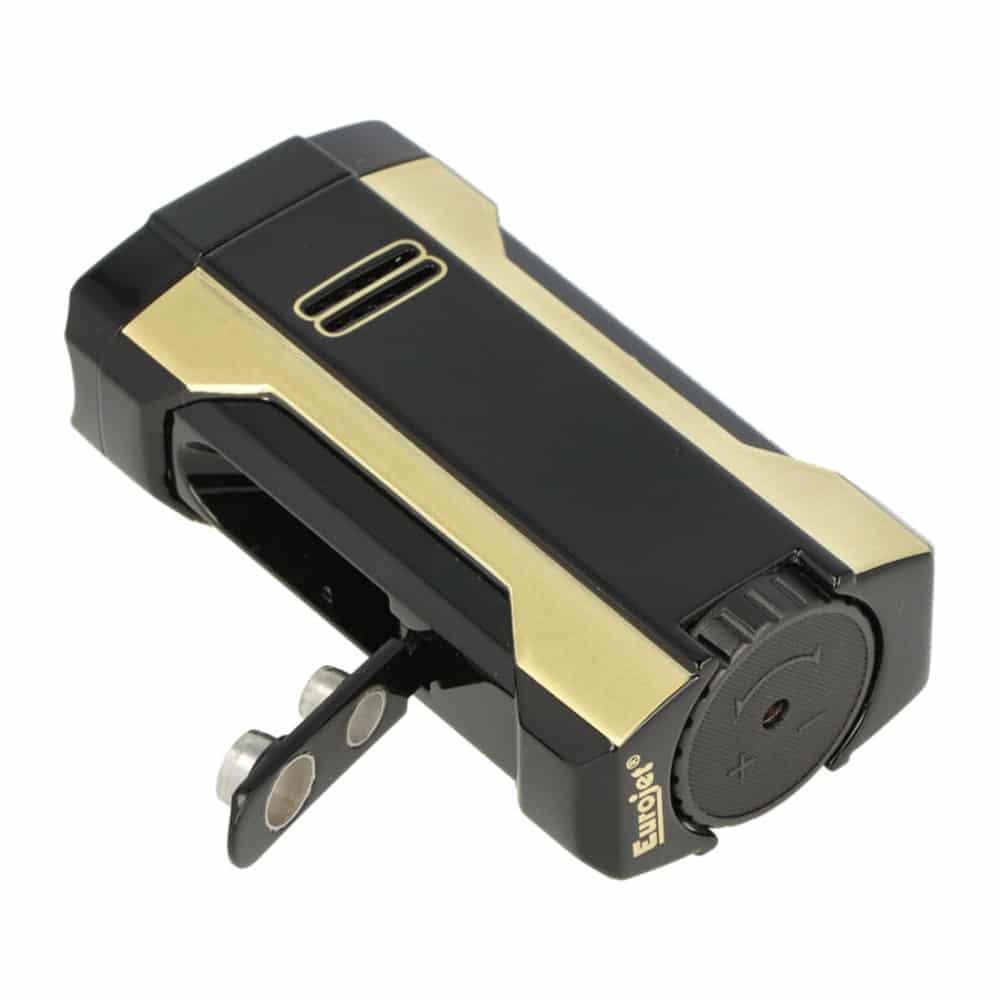 Eurojet windproof Quadruple Jet flame lighter. Four extra strong flames to light up your cigar easily and evenly. It has a full metal body in black and gold embossed smooth color. Top side acts as a base for your cigar. Also has a large wheel at the bottom of the lighter for adjusting the volume of the flames. At the left side of it you will find 2 different punches for your cigar in 2 sizes. Last but not least at the back side of this lighter you will find a small transparent piece of glass that allows you to see how much gas there is in it.