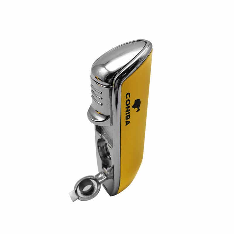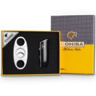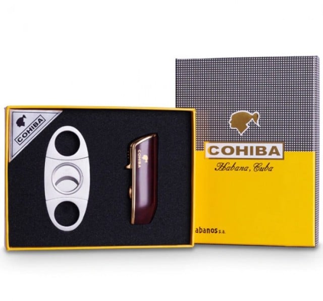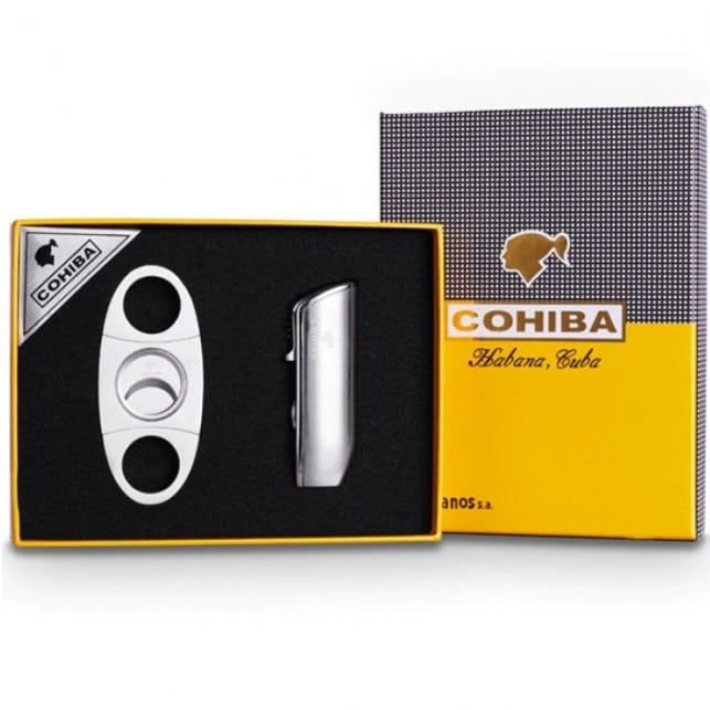 It consists of a triple jet lighter with built-in bullet punch cutter of premium quality and design and a double stainless steel guillotine cigar cutter. Available in three different colors: silver, yellow and black with a distinctive Cohiba logo.