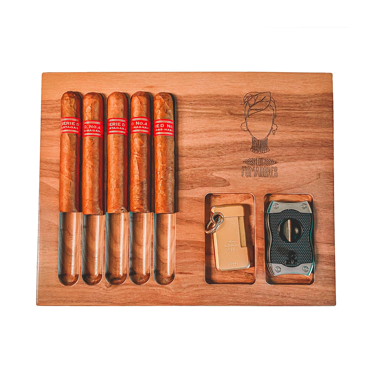 Luxury handcrafted American walnut tray for five cigars and custom shaped lighter and cigar cutter stands to accompany your favorite cigar. An original gift idea!