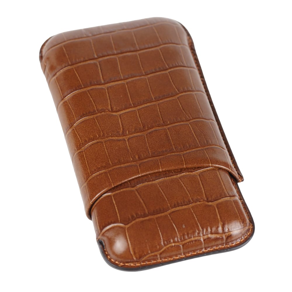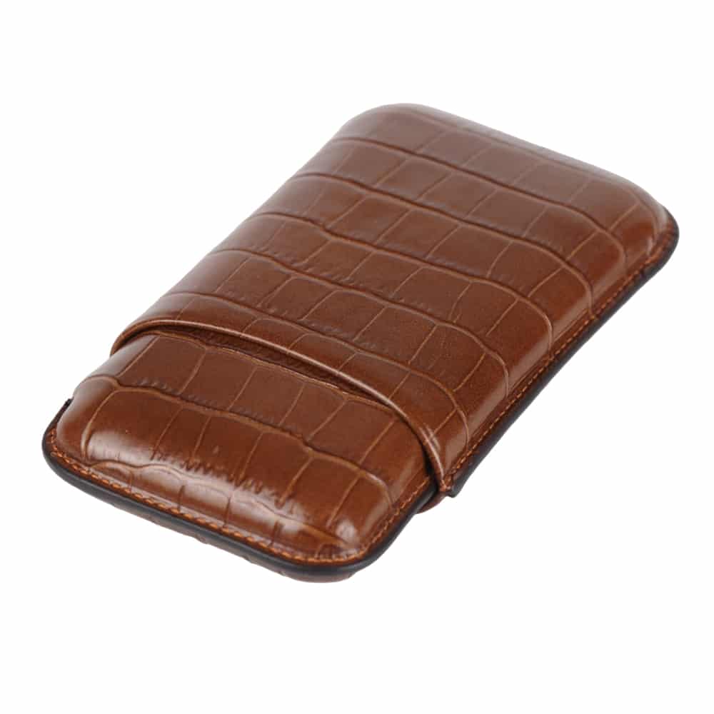 The 500 series is a collection of sizes tailored to the requirements of the modern smoker. It has embossed leather which is coated with a thin layer of goatskin and internally hydrophilic leather for better moisture retention. These cases are extremely durable and easy to clean with a slightly damp soft cloth. A very beautiful cigar case in croco brown designed to fit 3 robustos and ring up to 52.