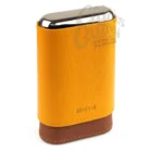Leather cigar case by MARVEL in elegant yellow and brown color. It features visible sewing lines, with two different leather patterns and shiny metal on each end. The interior is lined with Spanish cedar and can hold up to 3 cigars with a 60 ring. The length can be adjusted to fit long cigars.