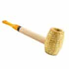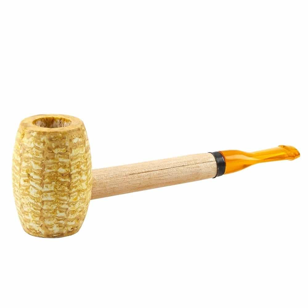The Pony Express Corn Cob Pipe from Missouri Meerschaum is a non-filtered straight pipe with a short, amber bit and a slim, barrel-shaped bowl with a small amount of color in the coating that gives the pipe a soft, yellow appearance.