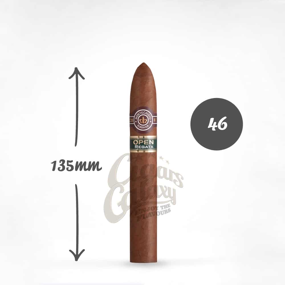 Regata is one more cigar from Montecristo Open line. With 46 ring its full of first quality cuban tobacco. Characterised by wonderful, melted grass flavor enriched with leather tones. It has a second band on the ring writing with gold letters the word «Open» and it has the name of the cigar. The official vitola is Forum.