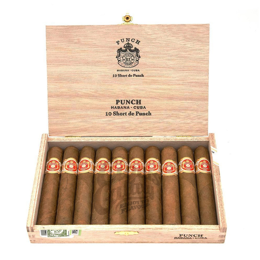 Short de Punch is the newest member of Punch from Cuba. It has been several years since the last addition to the Punch collection and the first time the manufacturer has chosen to release a Robustos cigar with a 50 ring, as all the previous ones had a smaller caliber. It is presented in a unvarnished wooden box of 10 cigars. The vitola is brand new and the cigars are wrapped in a Corojo wrapper.