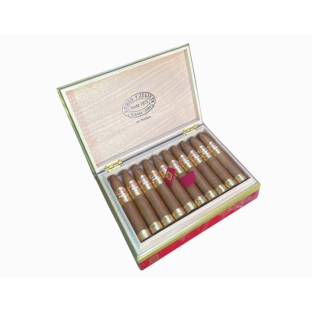 Romeo y Julieta Linea de Oro was originally announced in 2020 to commemorate 145 years of the iconic brand. The new line is presented in three sizes: Dianas, Hidalgos and Nobles. All three sizes have been blended to a medium to full taste, a step up from the famous medium bodied blend used in the classic range. The cigars are presented in stylish red lacquered boxes that carry an embossed medallion set on the lid. Each of the 20 cigars within are dressed with a bespoke band bearing the name of the individual vitola and a unique golden foot band that have edges trimmed with holographic elements. Charming aromas of fresh bread crust and nuts are surrounded by more fragrant, floral and discreetly fruity notes. The sweet smoke gains a tart malty cocoa undertone.