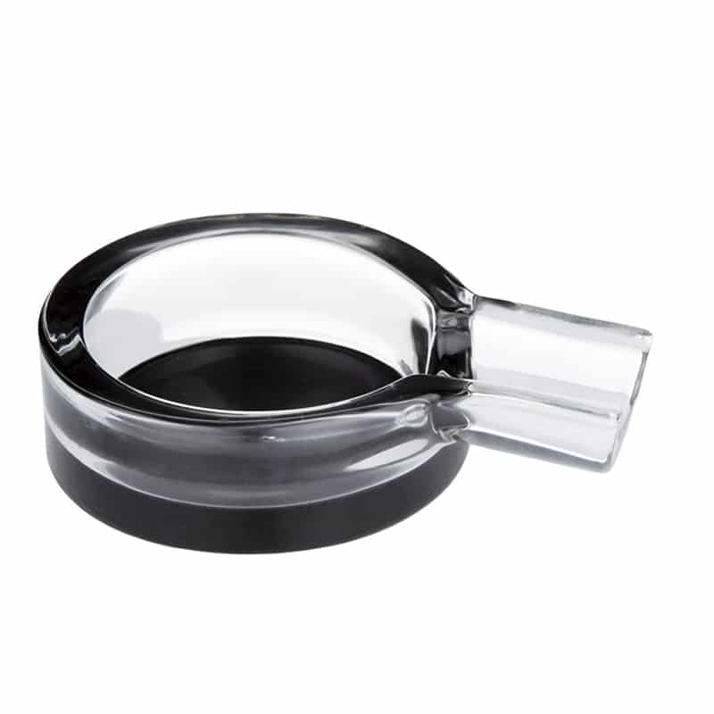 Transparent, round glass ashtray for one cigar with black color at the bottom of it.