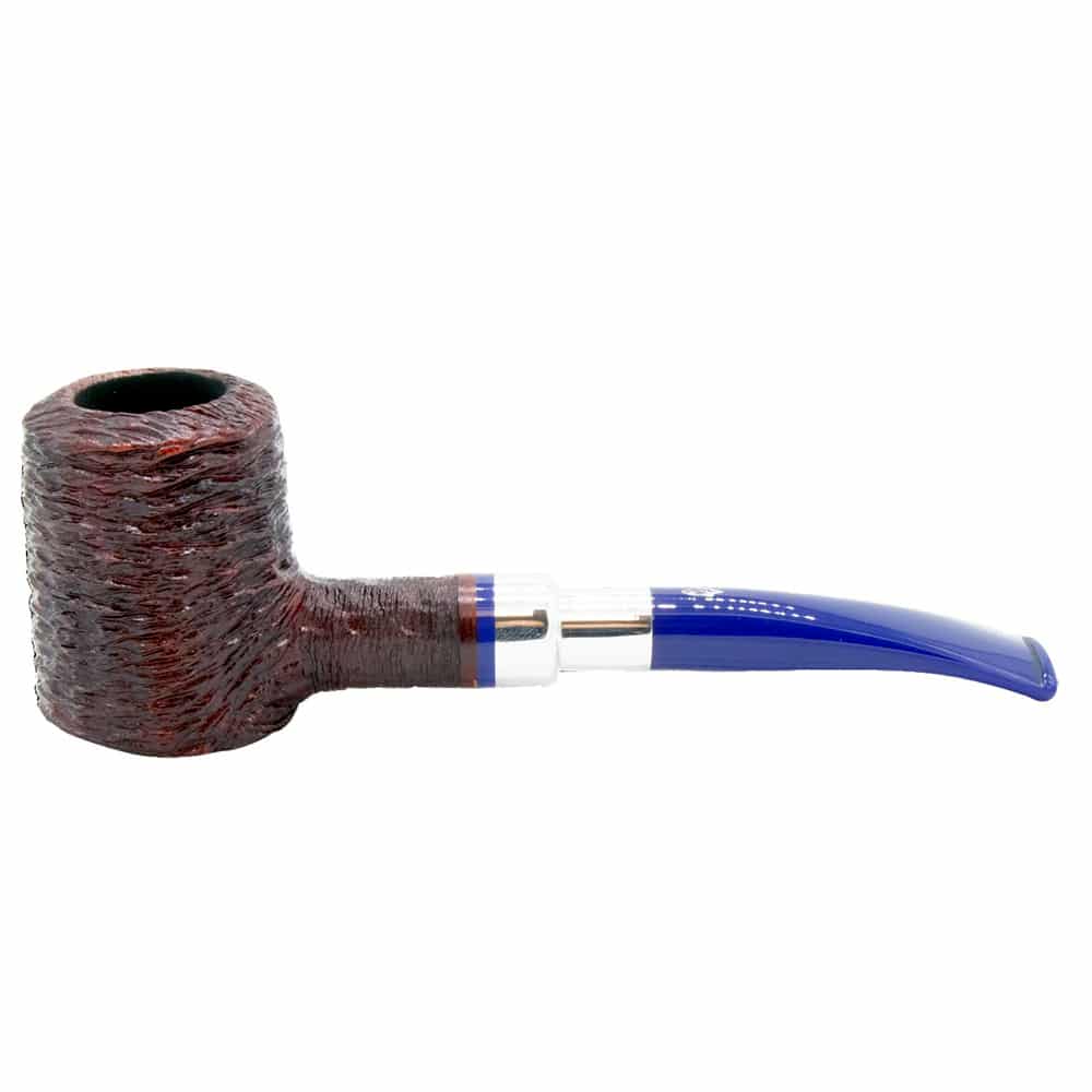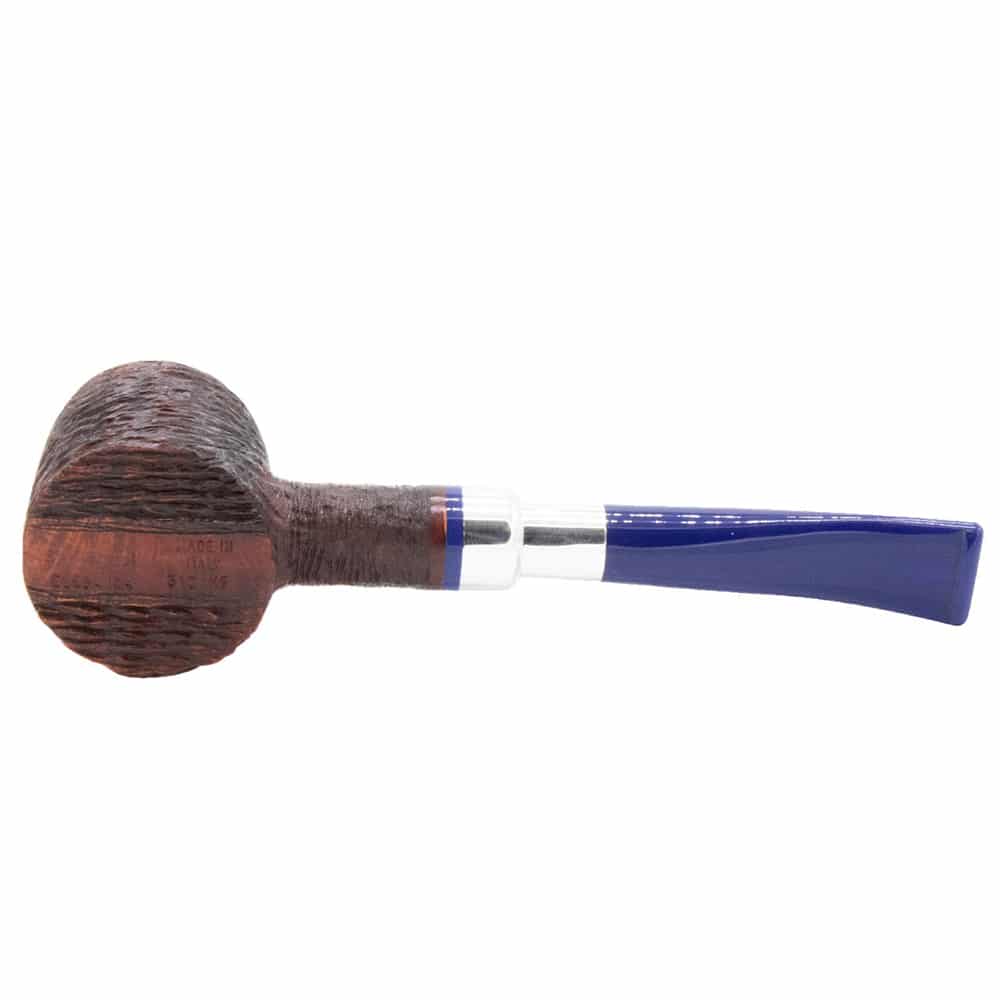 SAVINELLI new series matched the Italian elegance with the English style in Eleganza 310KS. The bowl has a half-bent Pot shape in a dark rustic brown finish with wonderful embossed details. The mouthpiece is acrylic, blue in color and fastened to a metal ring.