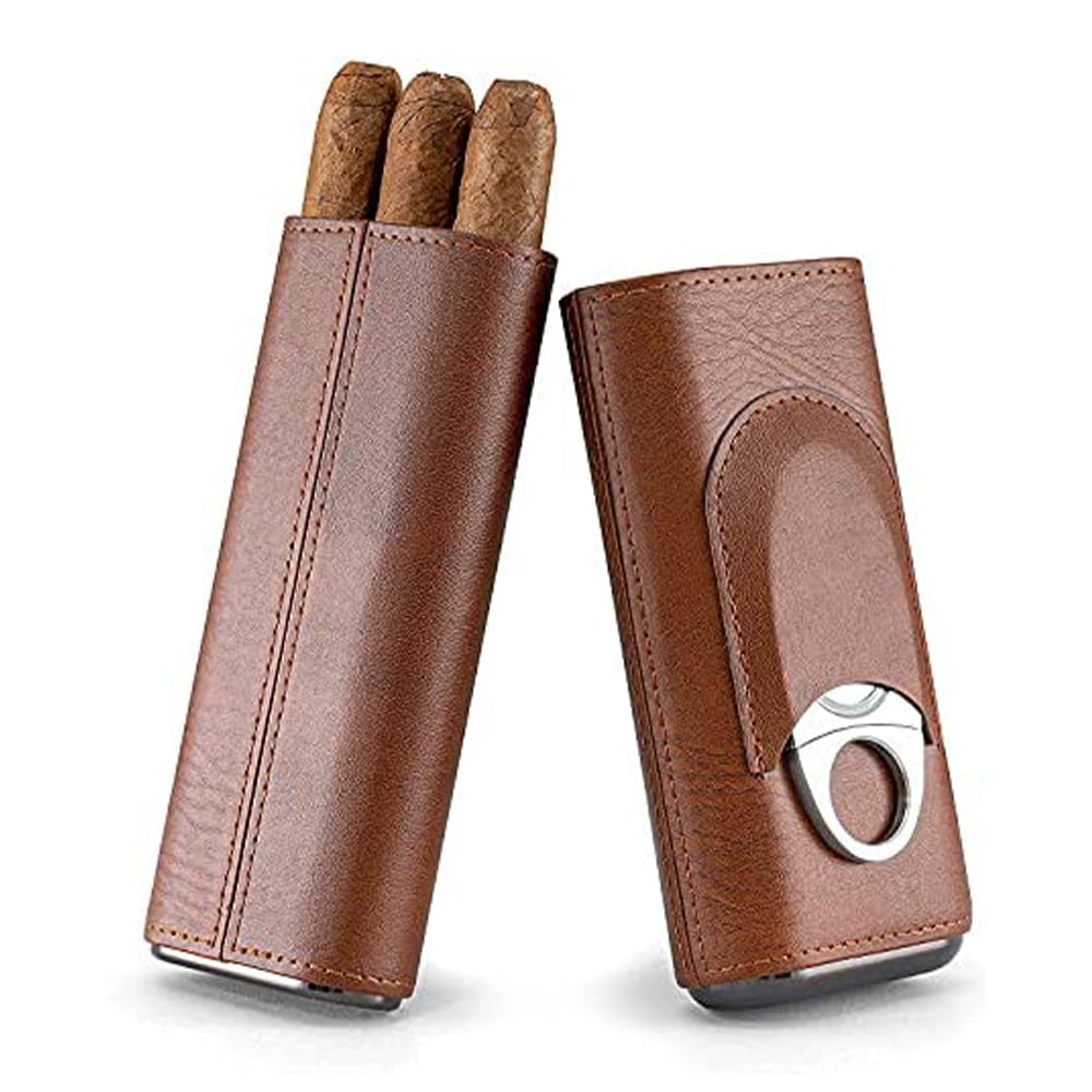 Quality cigar case for 3 cigars in brown colour with Sikarlan stainless steel guillotine cigar cutter.