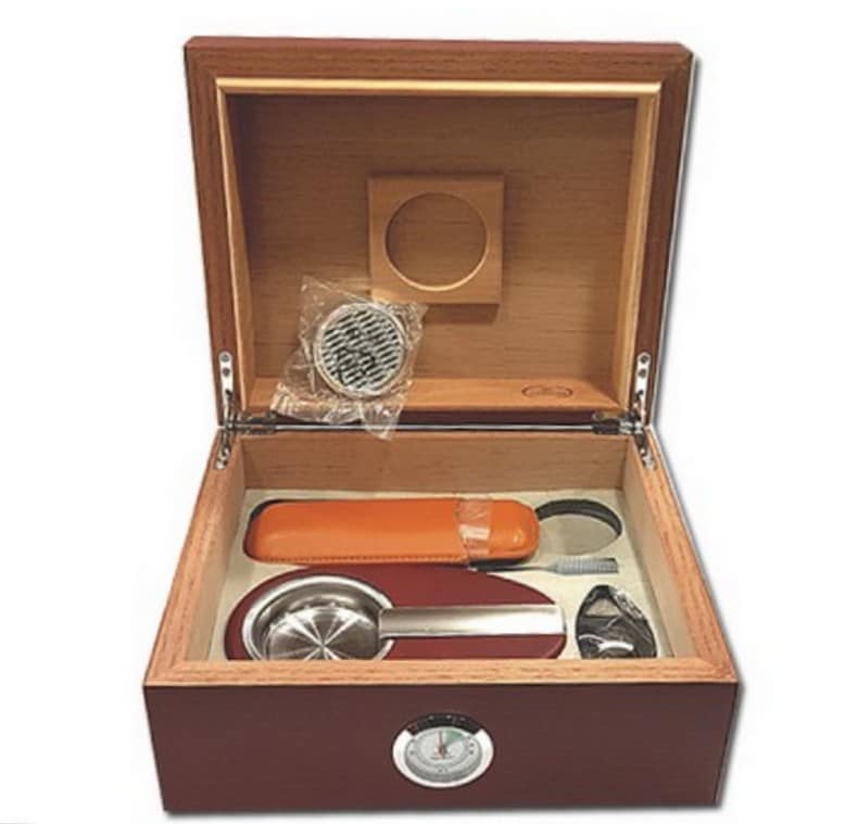 It has an inner lining made of Spanish cedar, an external hygrometer and an internal humidifier.