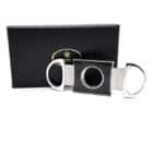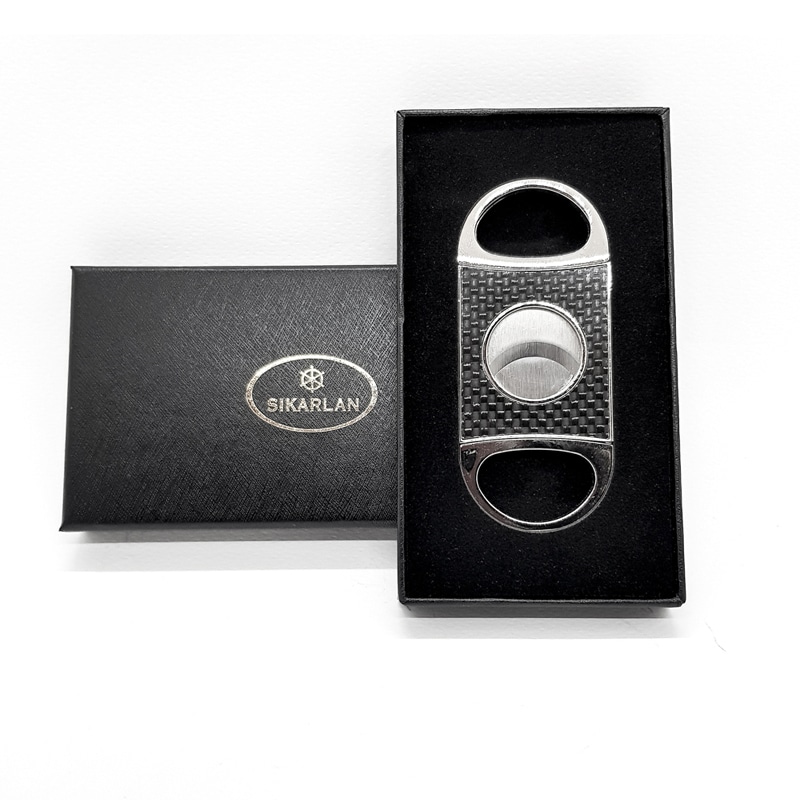 Sikarlan guillotine cigar cutter made of stainless steel in silver color and carbon look colored finish.