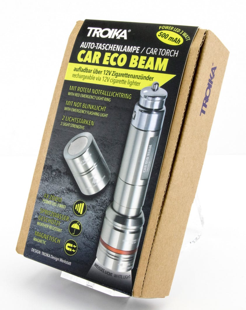 Clever thought! Torch in the car? CAR ECO BEAM has a smart solution for every need. Charging? No problem! It has a built-in 12V plug inserted into the cigarette lighter of the car and is charged directly from there. It is durable and environmentally friendly. It also has a magnet on the lid to hang on anything made of metal. And of course CAR ECO BEAM can “shine” in many ways! It has a white LED, 2 light intensities, 4 times zoom, and in the event of an emergency the red ring with flash function lights up. Take CAR ECO BEAM with you. Your car would take it!