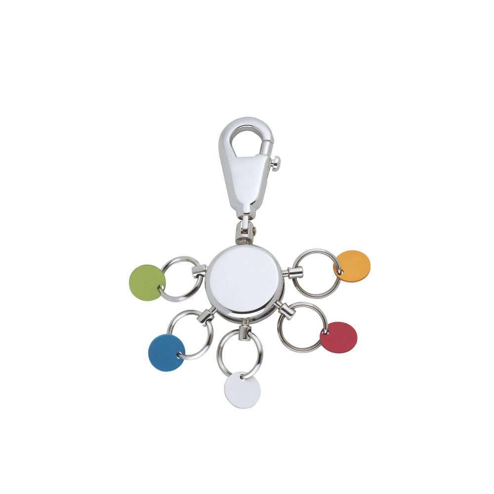 In a modern design with a large round and compact body, a metal hook to hang it wherever you want, and 5 large rings with colored tags for keys that can be easily removed or repositioned on the keychain with a simple movement. Thanks to the colored tags, you can easily locate the key you need without searching anymore. Now your keys, no matter how many, follow you, giving you the ability to use just one keychain!