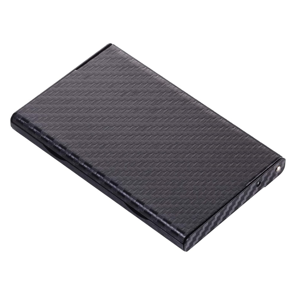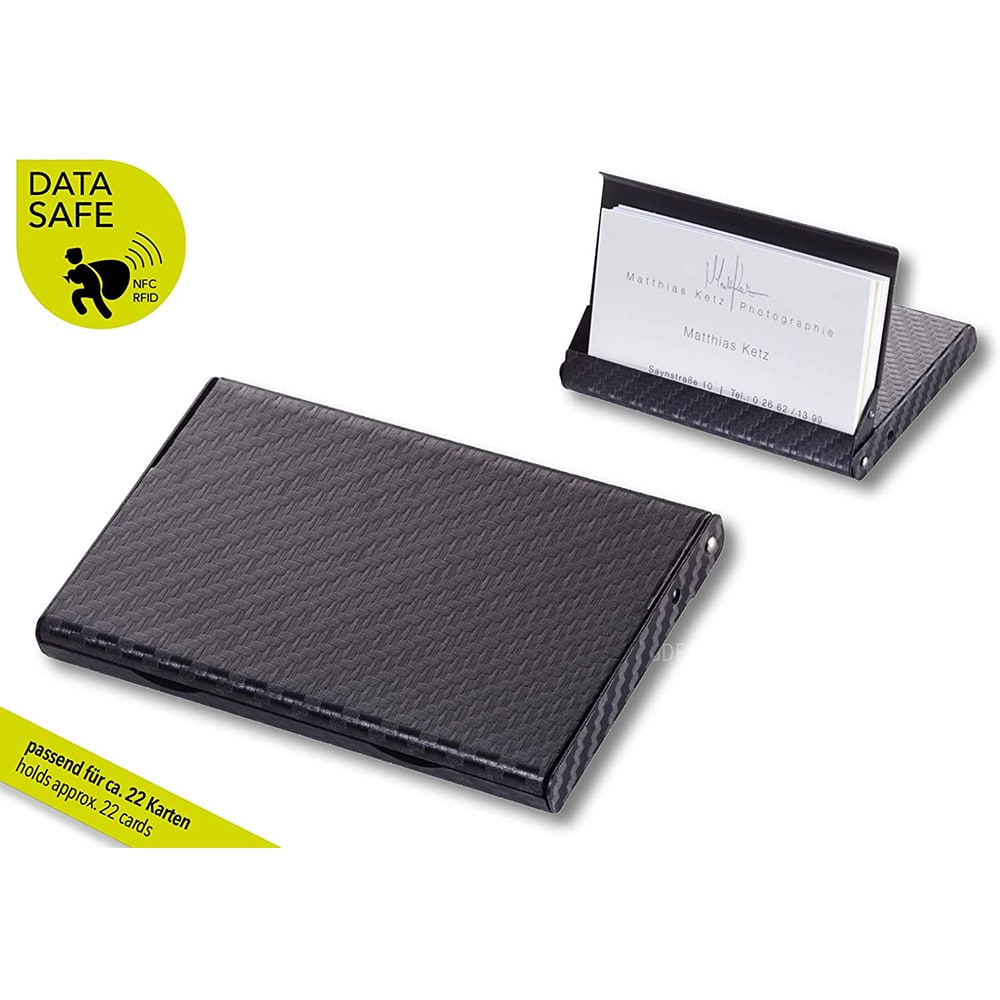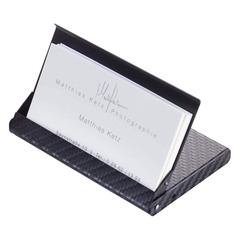 A wonderful combination of black aluminum and Carbon-Look, give the feeling of a professional with a modern style. It has closed notches so you can carry your credit and business cards without worrying about losing them and you can also open the case to the last position where it folds and functions as a stand for your office. There is room for about 6 credit cards or 20 business cards.