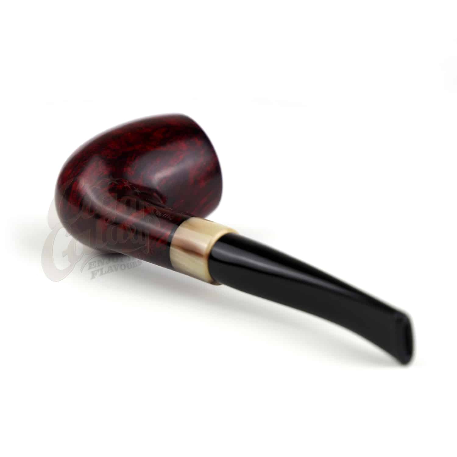 Half-bent, in smooth finish with the briar’s brown color being prominent. It has a black polished acrylic mouthpiece and a white-brown ring.