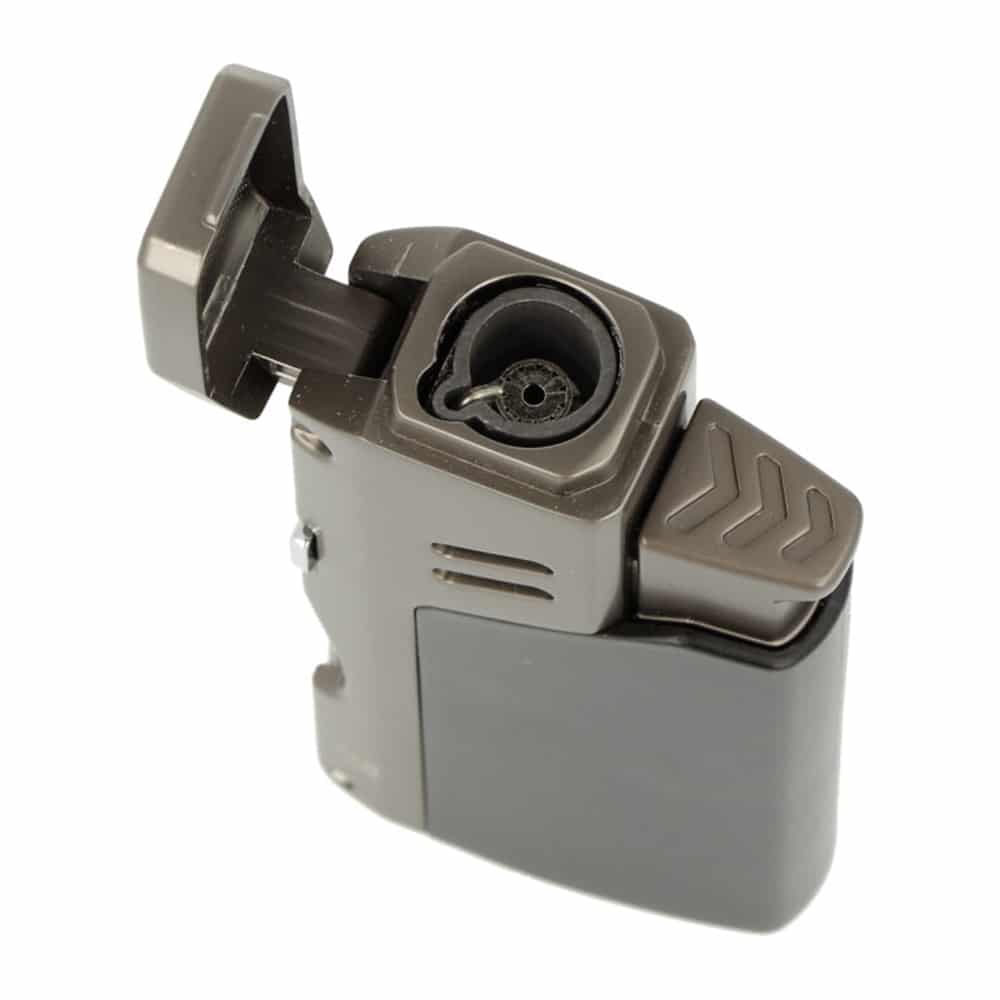Very modern and strong lighter with a single powerful jet flame and built-in punch cutter and draw tool, in grey color. It’s an easy to use lighter and refillable. Comes in an premium gift box.