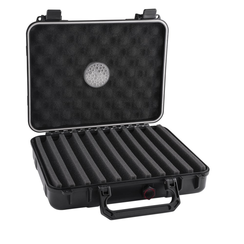 Xikar’s travel humidors are airtight and watertight and can withstand drops. They are made of solid plastic and contain cellular foam that keeps them watertight and airtight. They feature stainless steel hinges and secure locks. The high-density polyurethane foam lining protects your cigars. They feature foam humidifiers.