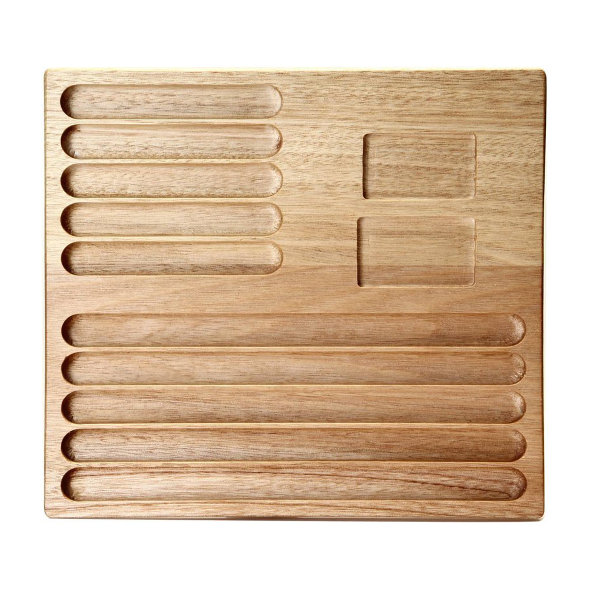 Αυτός ο ξύλινος δίσκος είναι εξοπλισμένος με πέντε εσοχές για πούρα μεγέθους Robusto, καθώς και πέντε μεγαλύτερες για το δημοφιλές μέγεθος Double Corona. Διαθέτει, επίσης, δύο ακόμα εσοχές για αναπτήρα και πουροκόπτη.