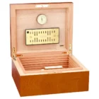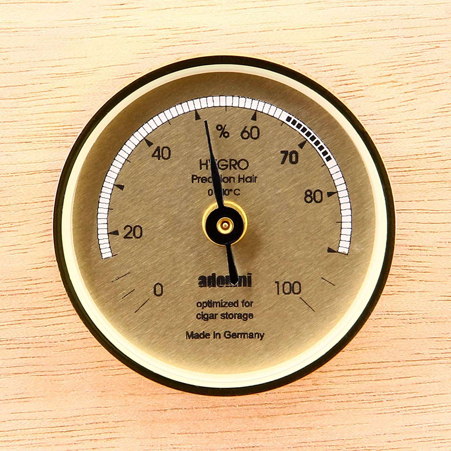 Υψηλής ποιότητας λάκα σε καφέ χρώμα με εξαιρετική σχεδίαση και καλιμπραρισμένο υγρόμετρο ακριβείας. Διαθέτει επίχρυσο υγραντικό Adorini Deluxe με ρυθμιζόμενα ανοίγματα για βέλτιστη ρύθμιση του επιπέδου υγρασίας και το σύστημα “RibTech” για την καλύτερη κυκλοφορία του αέρα μέσα στον υγραντήρα, καινοτομίας Adorini. Διαθέτει εσωτερική επένδυση 5mm Ισπανικού κέδρου.
