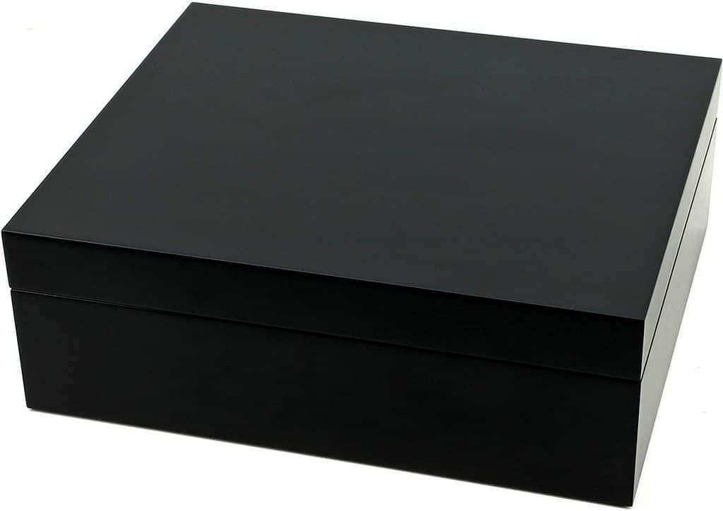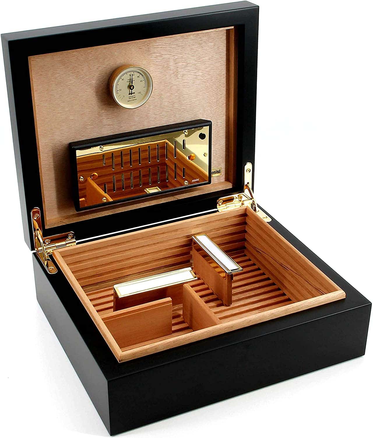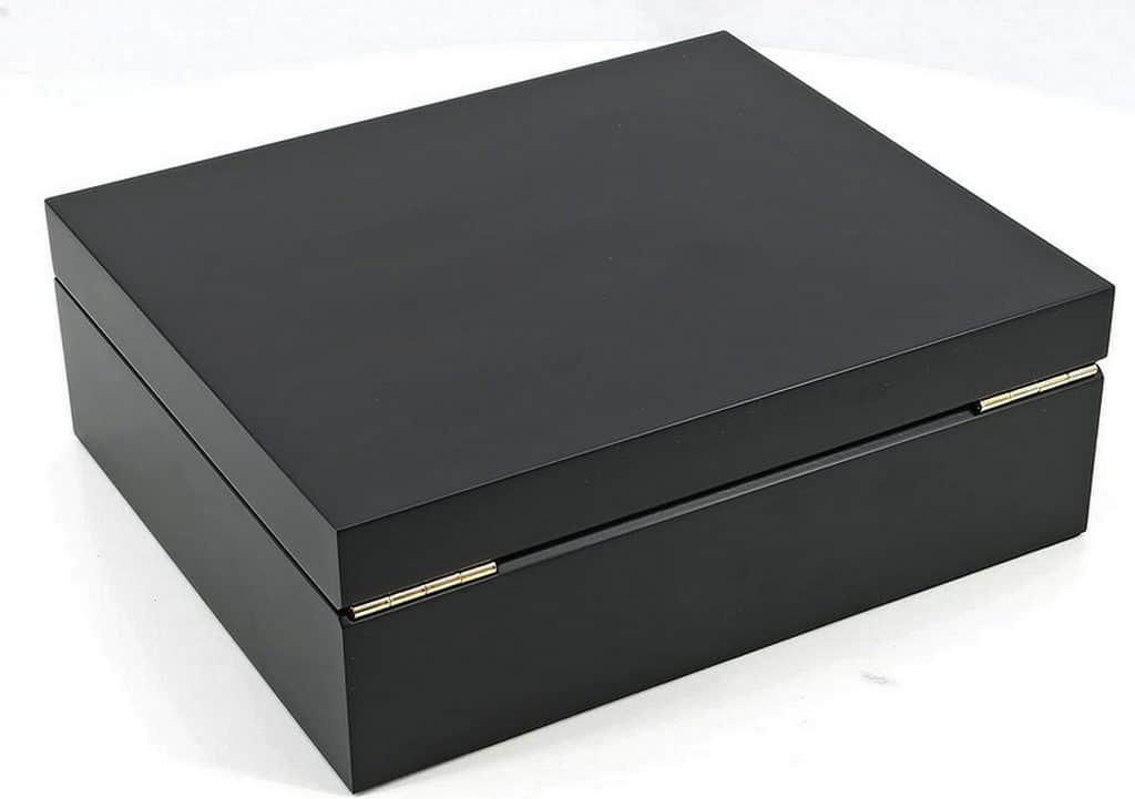 Υψηλής ποιότητας λάκα σε μαύρο χρώμα με εξαιρετική σχεδίαση και καλιμπραρισμένο υγρόμετρο ακριβείας. Διαθέτει επίχρυσο υγραντικό Adorini Deluxe με ρυθμιζόμενα ανοίγματα για βέλτιστη ρύθμιση του επιπέδου υγρασίας και το σύστημα “RibTech” για την καλύτερη κυκλοφορία του αέρα μέσα στον υγραντήρα, καινοτομίας Adorini. Διαθέτει εσωτερική επένδυση 5mm Ισπανικού κέδρου.