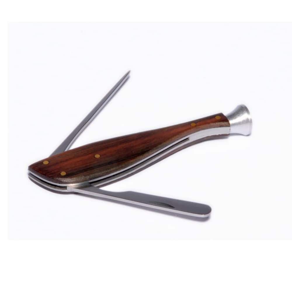 Αυτό το μεταλλικό εργαλείο καθαρισμού σε όμορφο σχέδιο με επένδυση σκούρου ξύλου διαθέτει ένα μακρύ στέλεχος, επίπεδη ξύστρα για το μπολ και η βάση του χρησιμοποιείται ως tamper για τον καπνό.