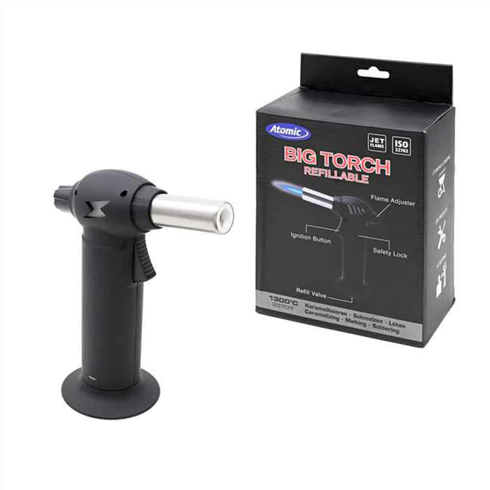 Atomic επιτραπέζιος αναπτήρας jet. Από ανθεκτικό πλαστικό και εξαιρετικά δυνατή φλόγα. Εύκολο άναμμα χάρη στη σκανδάλη του και κλείδωμα ασφαλείας. Πολύ πρακτικός, με μεγάλο ρεζερβουάρ. Ξαναγεμίζει με βουτάνιο. Ανάψτε το πούρο, τα κεριά, τα πάντα! Δεν τον χάνετε ποτέ! Ιδανικός και για ζαχαροπλαστική!