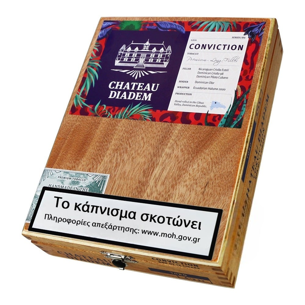 To Conviction σας προσκαλεί να απολαύσετε ένα πούρο πλούσιο σε αρώματα που εξελίσσονται κατά τη διάρκεια της απόλαυσής του. Αυτό το εξαιρετικά πλούσιο χαρμάνι διαθέτει νότες καβουρδισμένου καφέ, καθώς οι ηφαιστειακοί εδαφικοί πυρήνες της Νικαράγουα συνδυάζονται με τα χαρακτηριστικά μαλακά και κρεμώδη φύλλα από τη Δομινικανή Δημοκρατία. Η δέσμευση για την τελειότητα ξεπερνάει το μείγμα. Κάθε πούρο υπόκειται σε προσεκτικό έλεγχο για τη σύσταση και το χρώμα του. Μόνο αυτά που περνούν τα αυστηρά πρότυπα της Chateau Diadem τιμούνται με το προνόμιο της ωρίμανσης. Αυτά τα επιλεγμένα πούρα αφήνονται να ξεκουραστούν για 4 έως 6 μήνες, ένα διάστημα υπομονής και αναμονής, όπου οι ξεχωριστές γεύσεις του καπνού έχουν την ευκαιρία να ενωθούν και να εξελιχθούν, ωριμάζοντας σε έναν εκλεπτυσμένο συνδυασμό γεύσης.