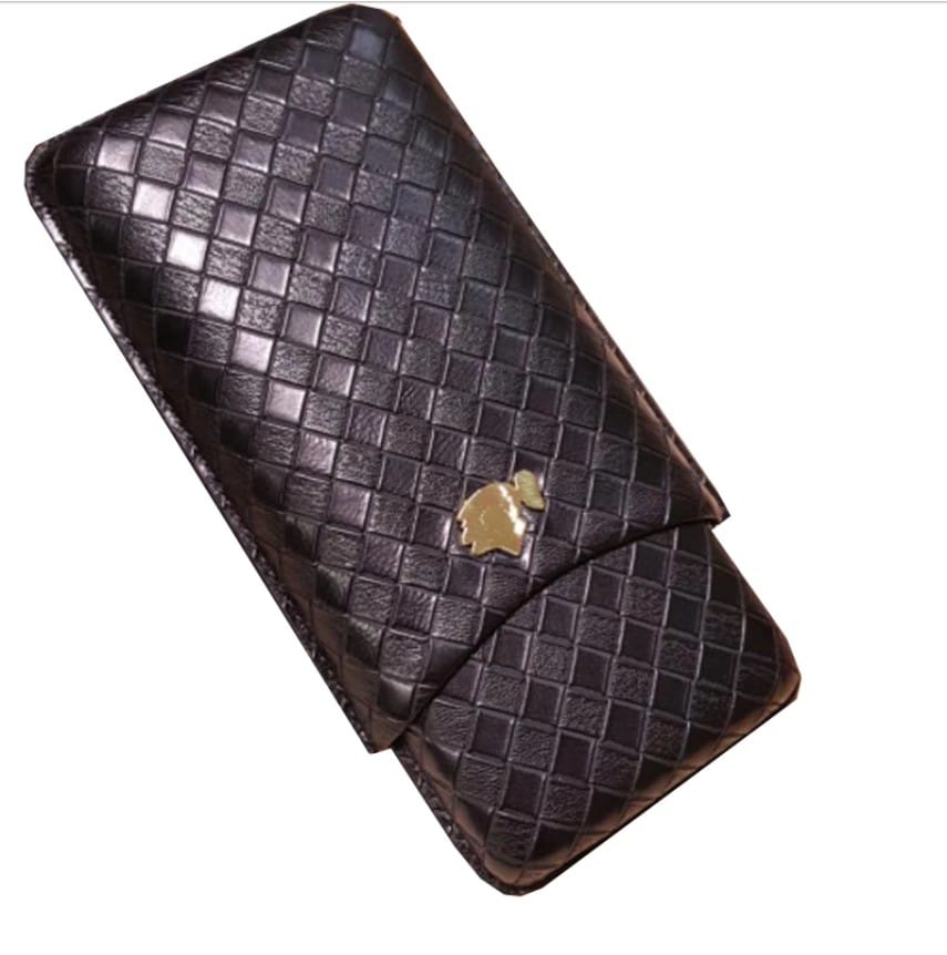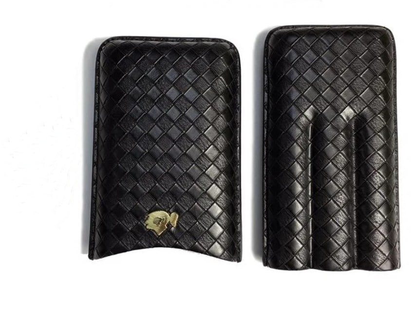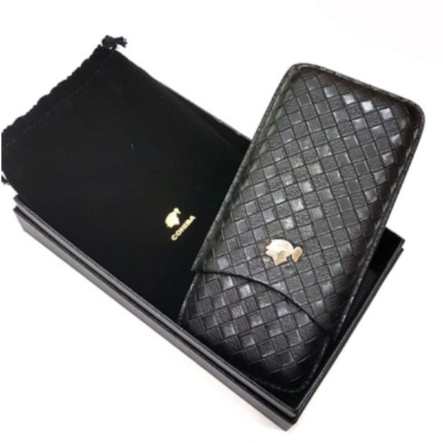 Πουροθήκη για τρία πούρα από γνήσιο δέρμα σε μαύρο χρώμα με “πλεκτή” όψη και διακριτικό σήμα της Cohiba σε χρυσό, που χωράει κοντά και μακριά πούρα Magnum, Toro ή και Churchills.