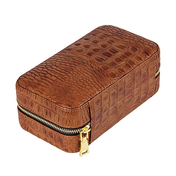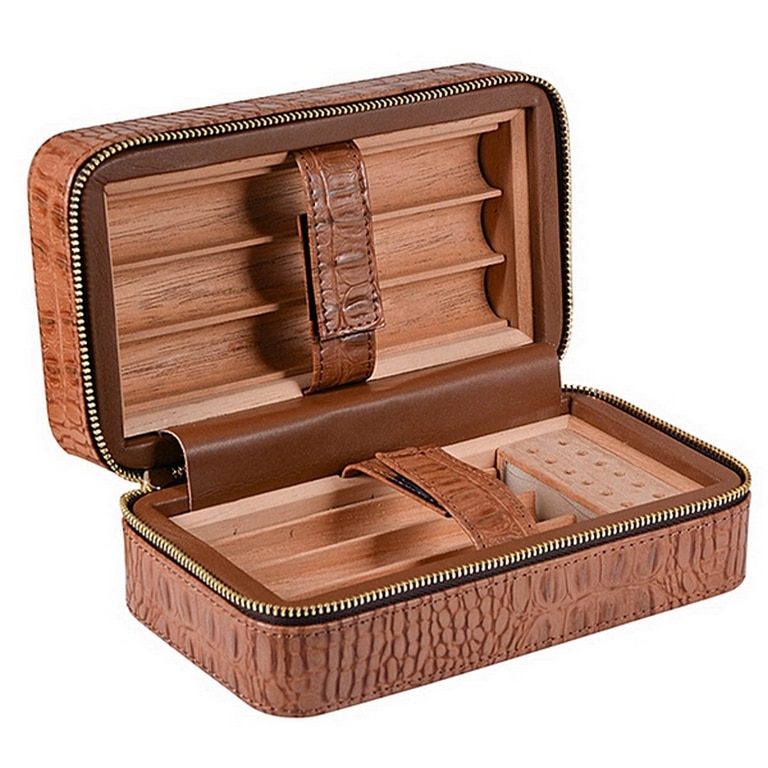 Δερμάτινος υγραντήρας / humidor πούρων ταξιδιού της Sikarlan σε καφέ croco χρώμα που κλείνει με φερμουάρ για μεγαλύτερη ασφάλεια. Έχει εσωτερική επένδυση κέδρου με αποσπώμενη θήκη για έξι πούρα. Το υγραντικό στοιχείο βρίσκεται σε διάτρητη κέδρινη θήκη με ειδικό απλικατέρ για την τοποθέτηση του απιονισμένου νερού.