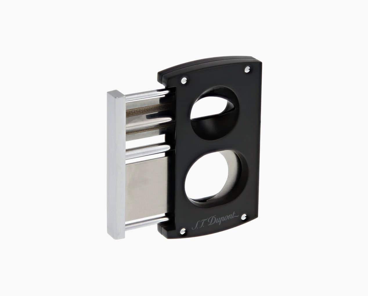 Ένας καταπληκτικής σχεδίασης πουροκόπτης από την ST Dupont, σε μαύρο χρώμα και chrome λεπτομέρειες. Διαθέτει δύο διαφορετικές λεπίδες, μία για V-cut και μία γκιλοτίνα. Το κόψιμο γίνεται σε μία μόνο κίνηση και επιπλέον υπάρχει μηχανισμός για να κλείνουν οι λεπίδες με ασφάλεια.