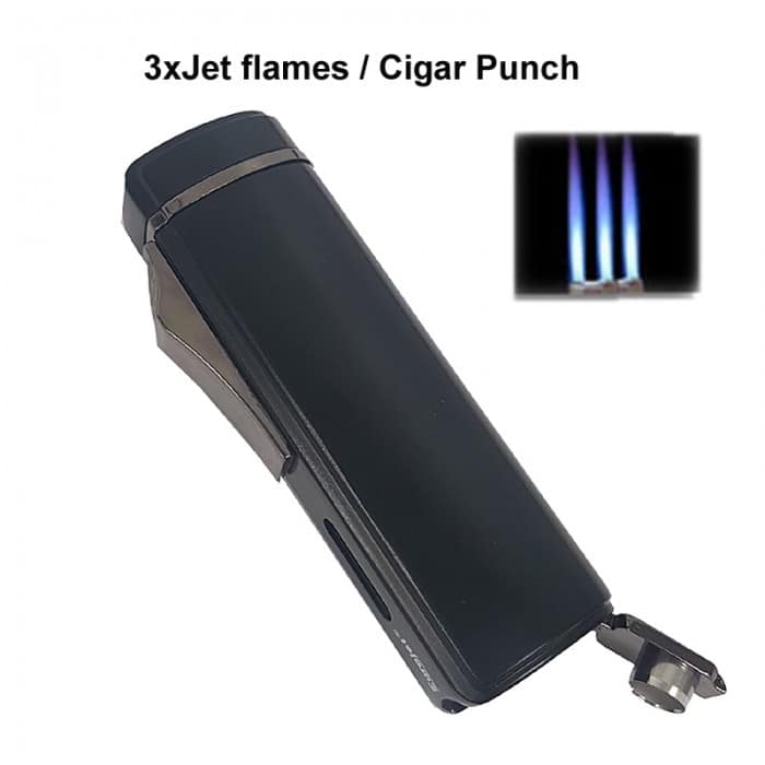 Εξαιρετικής ποιότητας jet flame αναπτήρας από τη Eurojet με τρείς φλόγες και ενσωματωμένο πουροκόπτη punch. Με μαύρο μεταλλικό σώμα και gunmetal λεπτομέρειες.