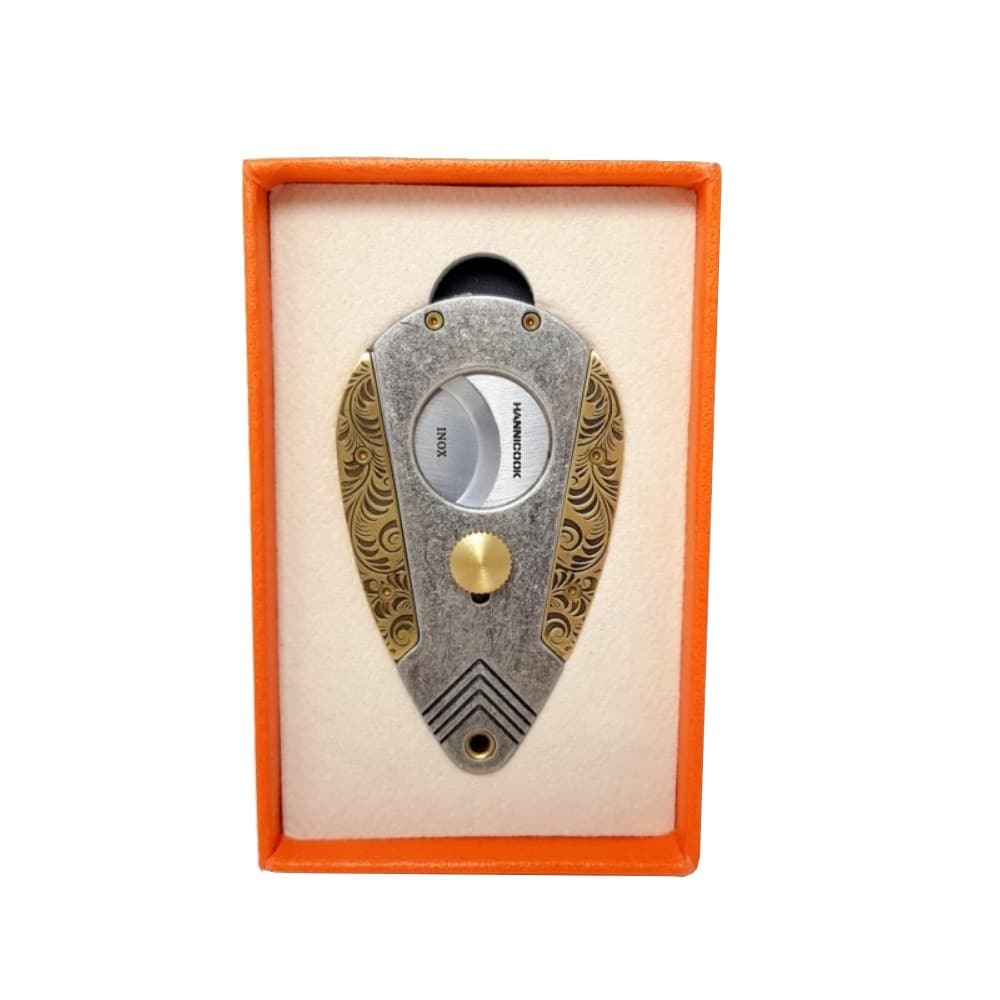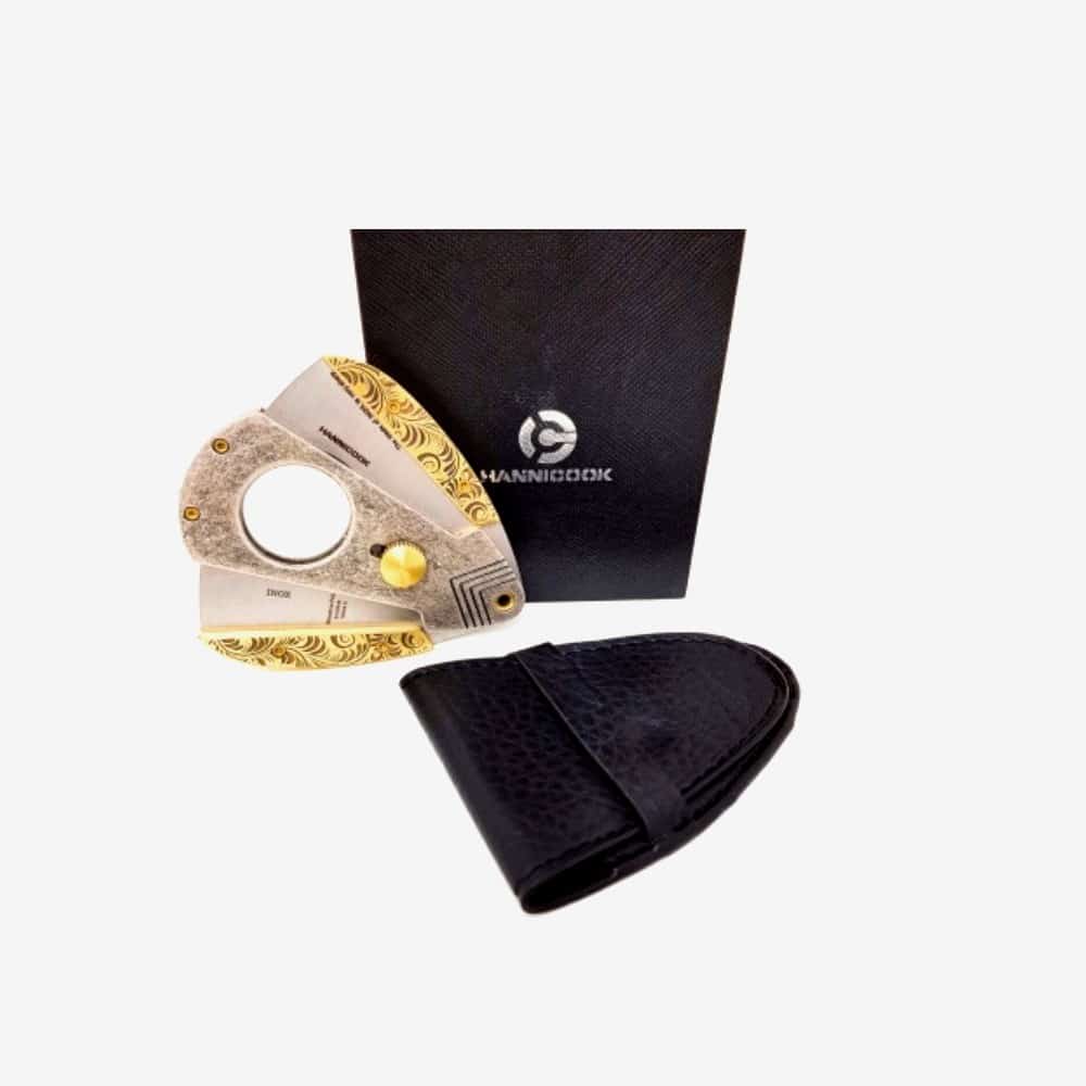 Μεταλλικός κόπτης πούρων διπλής γκιλοτίνας της Hannicook από ανοξείδωτο ατσάλι & χρυσές λεπτομέρειες σε μοντέρνο design με μεγάλα ανοίγματα και στιβαρό σώμα.