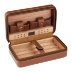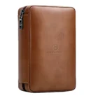 Δερμάτινος υγραντήρας / humidor πούρων ταξιδιού της Hanicook σε καφέ χρώμα με κίτρινες ραφές, ενώ κλείνει με φερμουάρ για μεγαλύτερη ασφάλεια. Έχει εσωτερική επένδυση κέδρου με θήκη για τέσσερα πούρα. Το υγραντικό στοιχείο βρίσκεται σε διάτρητη κέδρινη θήκη με ειδικό απλικατέρ για την τοποθέτηση του απιονισμένου νερού.