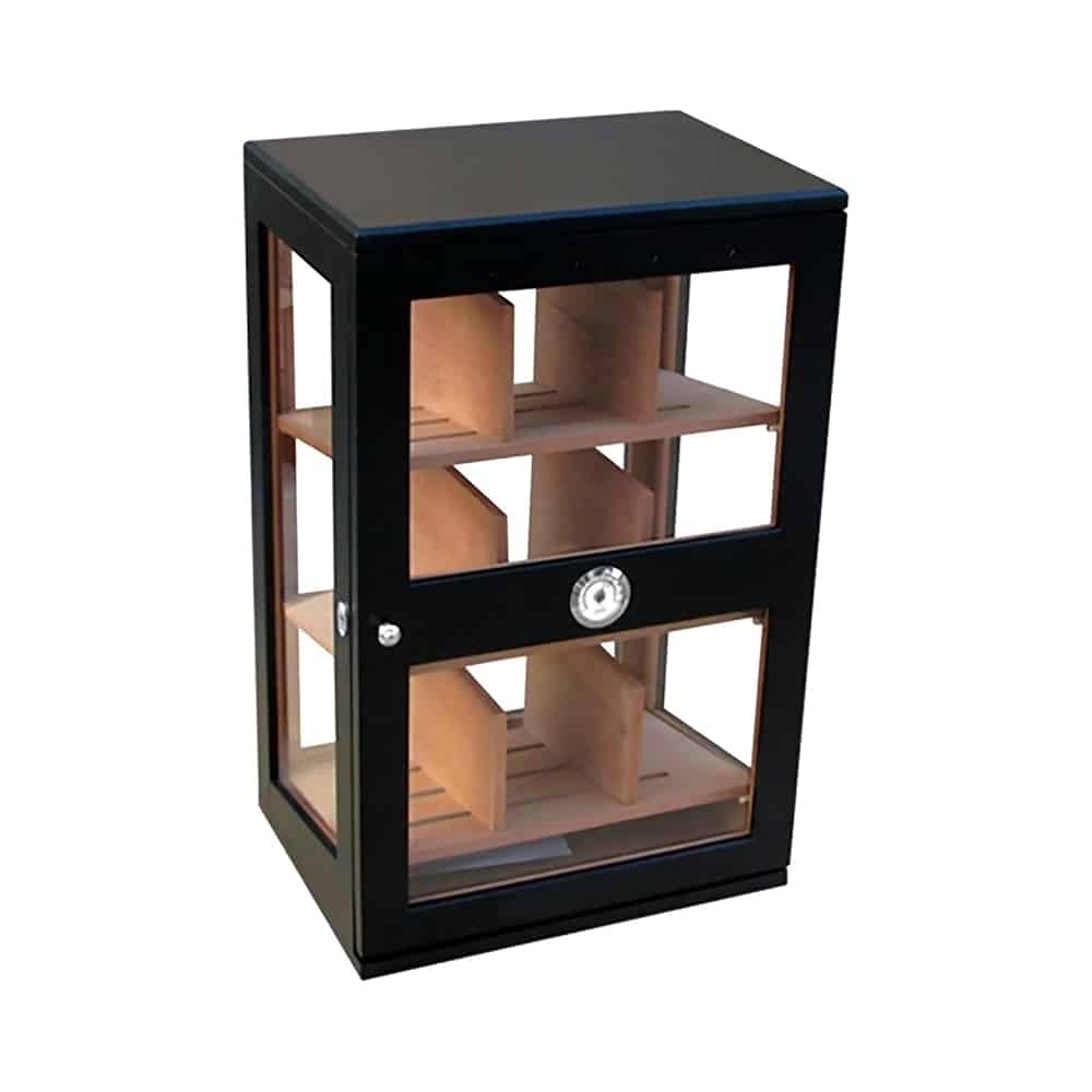 Ένας Πύργος για τα Πούρα σας! Yγραντήρας πούρων βιτρίνα, σε matte φινίρισμα, με μαύρο χρώμα. Διαθέτει γυάλινο τζάμι περιμετρικά και εσωτερικά επένδυση κέδρου. Αποτελείται από 3 ράφια και 6 διαχωριστικά, από Ισπανικό κέδρο. Με αναλογικό υγρόμετρο τοποθετημένο εξωτερικά, στο κέντρο της πόρτας για εύκολο έλεγχο της υγρασίας. Περιλαμβάνει δύο υγραντικά στοιχεία με gel. Μπορεί να δεχθεί μέχρι 120 πούρα. Διαθέτει κλειδαριά.