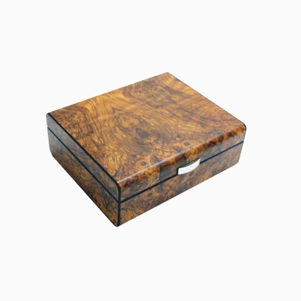 Υγραντήρας εξαιρετικής ποιότητας κατασκευής σε χρώμα ανοιχτό καφέ σε ματ φινίρισμα, με φωτεινά νερά ξύλου και εσωτερική επένδυση από κέδρο για 20-25 πούρα. Εσωτερικά στο καπάκι βρίσκεται ένα όμορφο πλαίσιο για τοποθετήσετε το υγρόμετρο και το υγραντικό στοιχείο.