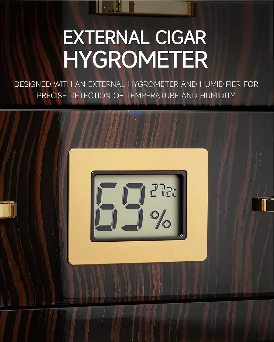 Σχεδιασμένος για τον σύγχρονο aficionado, αυτός ο υγραντήρας προσφέρει κομψότητα και αξιοπιστία σε ένα συμπαγές, τετράγωνο σχήμα. Το μαύρο γυαλιστερό φινίρισμα με εφέ ξύλου τονίζει την αισθητική του, ενώ το τζάμι στην πρόσοψη προσθέτει διακριτική πολυτέλεια.