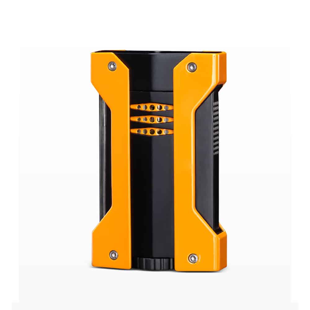 Αναπτήρας μονής φλόγας, αντιανεμικός, κατασκευασμένος από μέταλλο, ιδανικός για το άναμμα του πούρου σας σε εντυπωσιακό πορτοκαλί και μαύρο χρώμα.