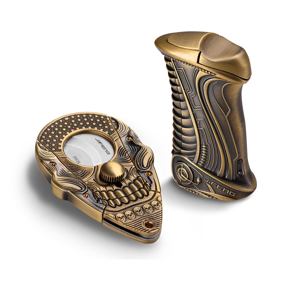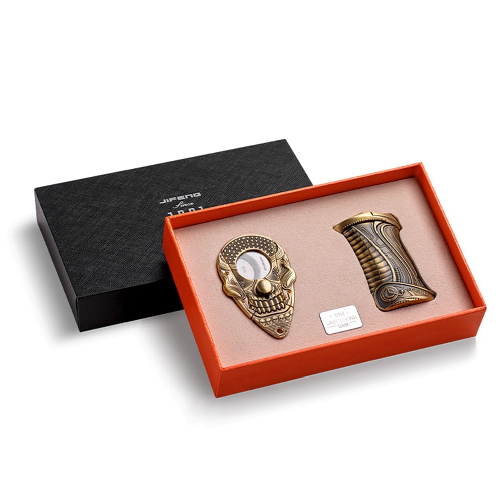 Ένα πολύ όμορφο σετ για κάθε καπνιστή πούρου! Αποτελείται από ένα μεταλλικό αναπτήρα jet με μονή φλόγα εξαιρετικής ποιότητας και design και ένα μεταλλικό πουροκόπτη γκιλοτίνα. Ένα εξαιρετικό δώρο για κάθε καπνιστή!