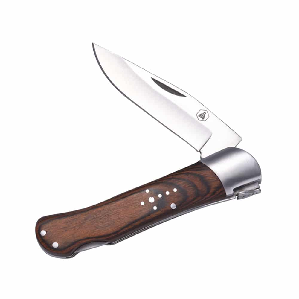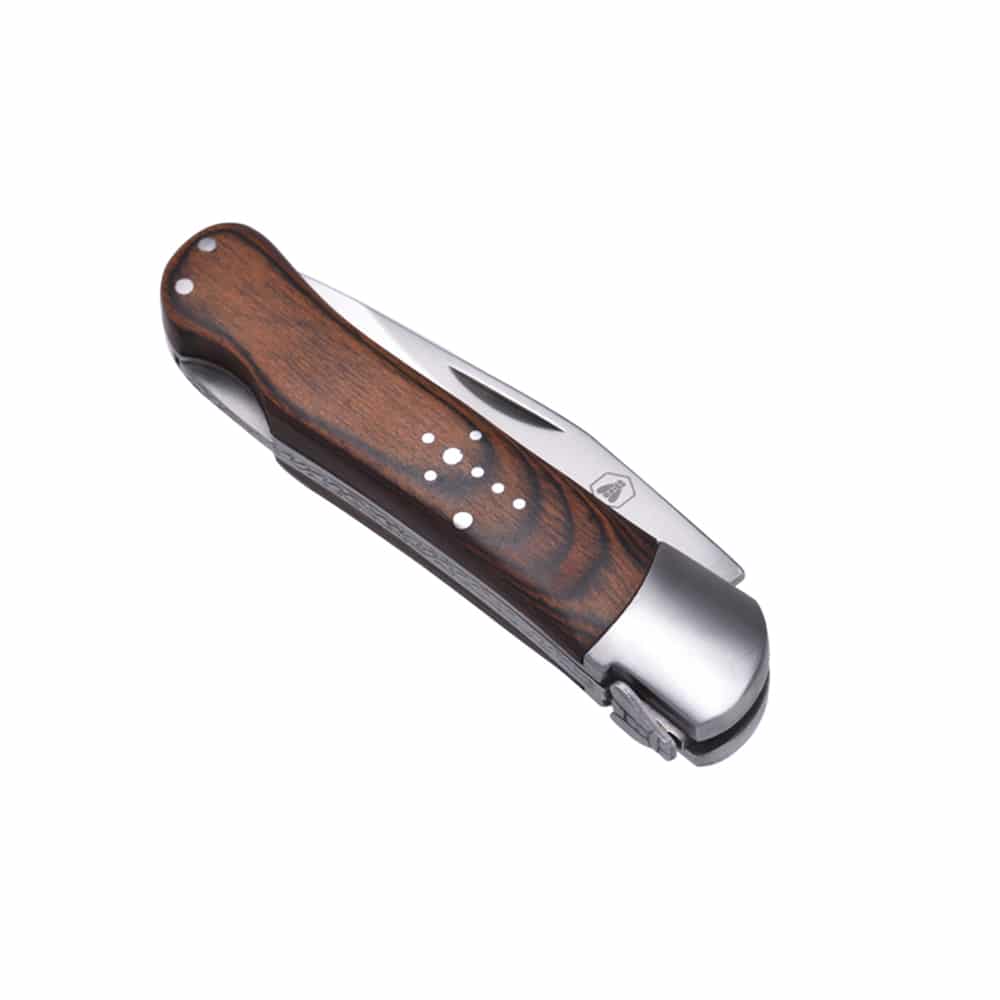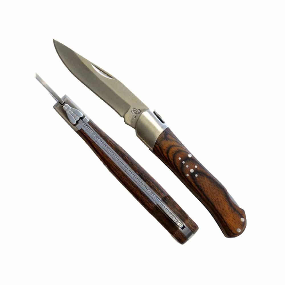 Laguiole αναδιπλούμενος σουγιάς από ανοξείδωτο ατσάλι και επικάλυψη ξύλου, για επαγγελματική και καθημερινή χρήση, με κλείδωμα ασφαλείας και πολύ όμορφο σχεδιασμό. Στολισμένο με το χαρακτηριστικό σταυρό από μεταλλικές ψηφίδες. Συνοδεύεται από κουτί δώρου.